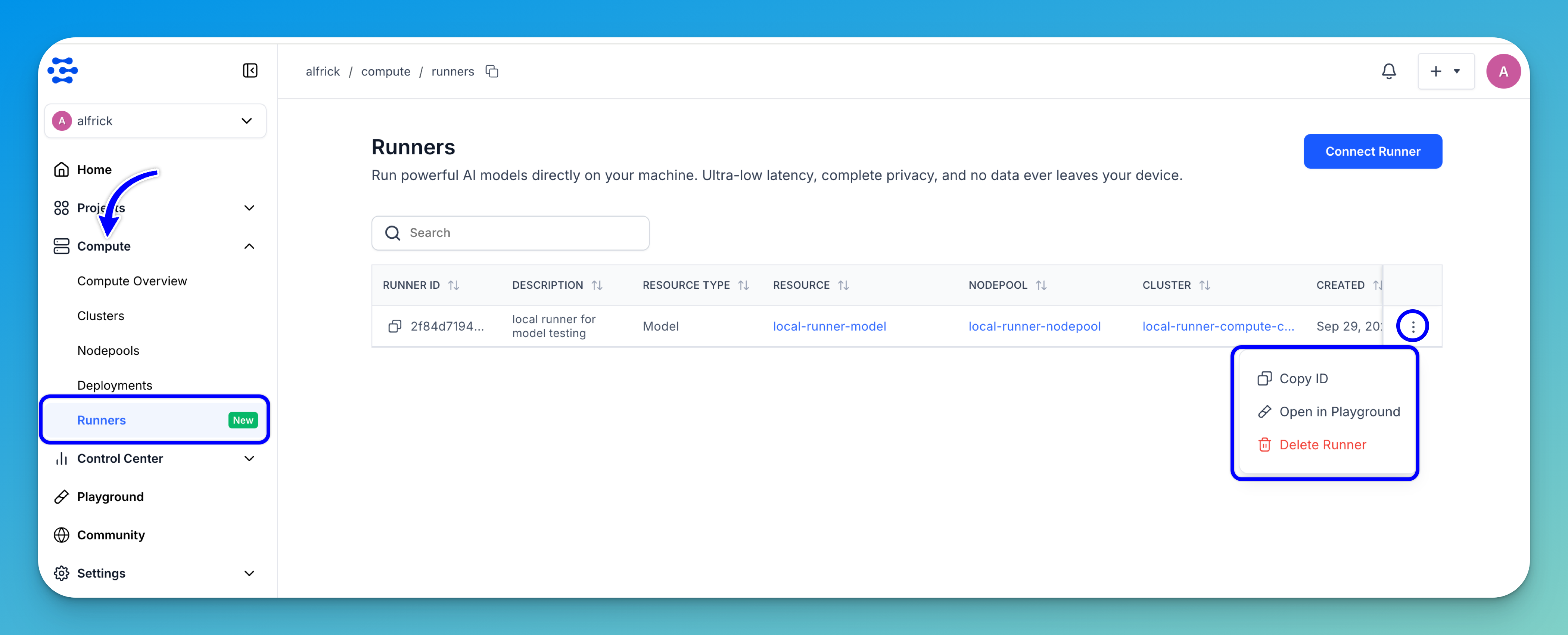 Alternatively, while your runner is active in the terminal, you can open the Runners dashboard on the Clarifai platform, locate your runner in the table, and select Open in Playground from the three-dot menu to start chatting with the model.