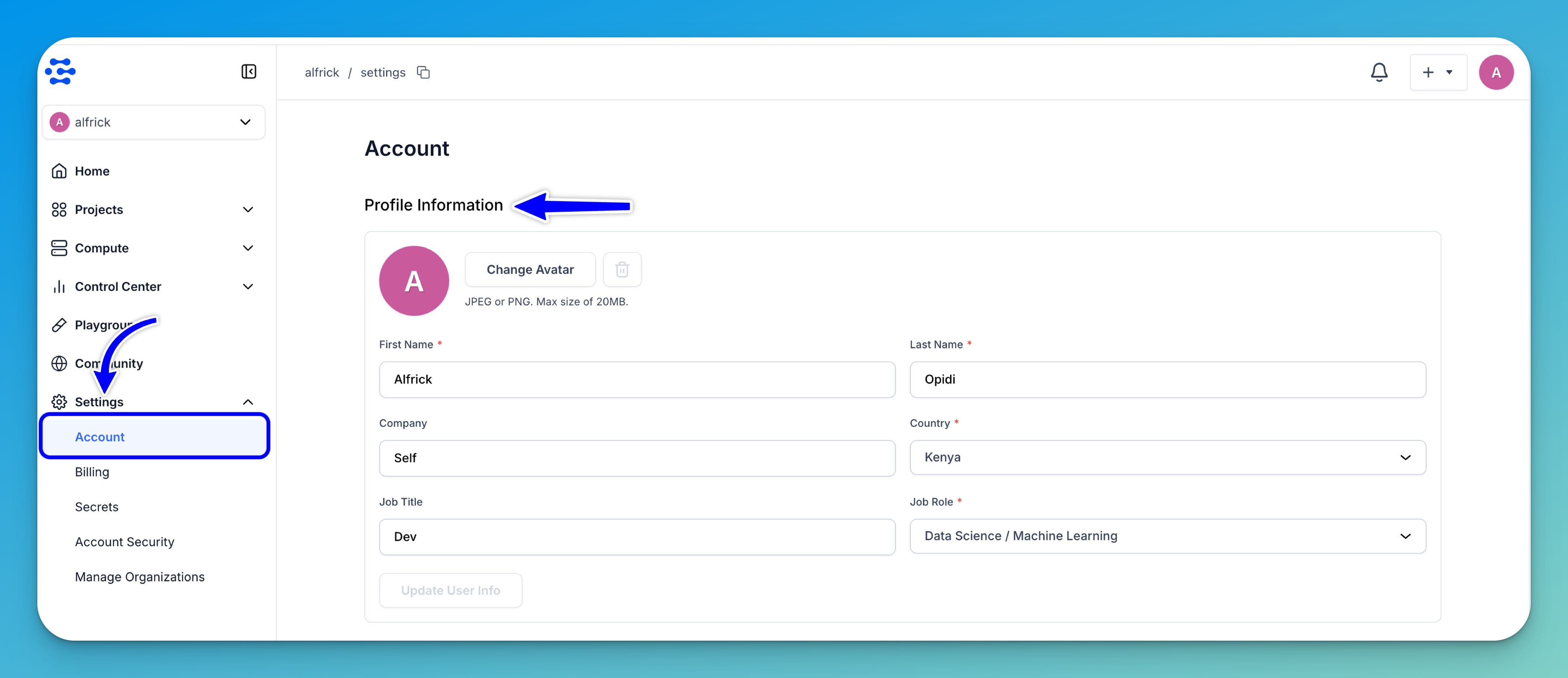 You can customize how you appear across the Community platform — such as on shared model or app pages — by uploading a profile avatar. If no image is uploaded, your initials will be shown instead.