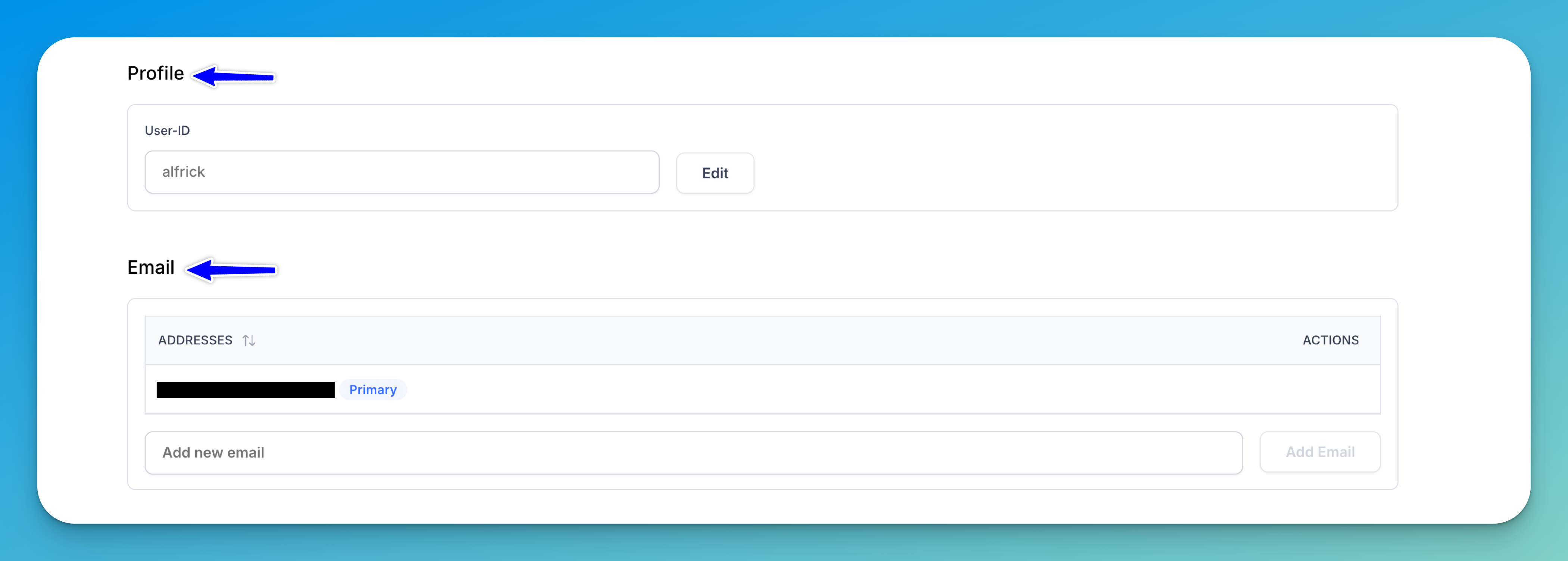 This section lists and manages all email addresses associated with your account and indicates which one is set as your Primary contact.