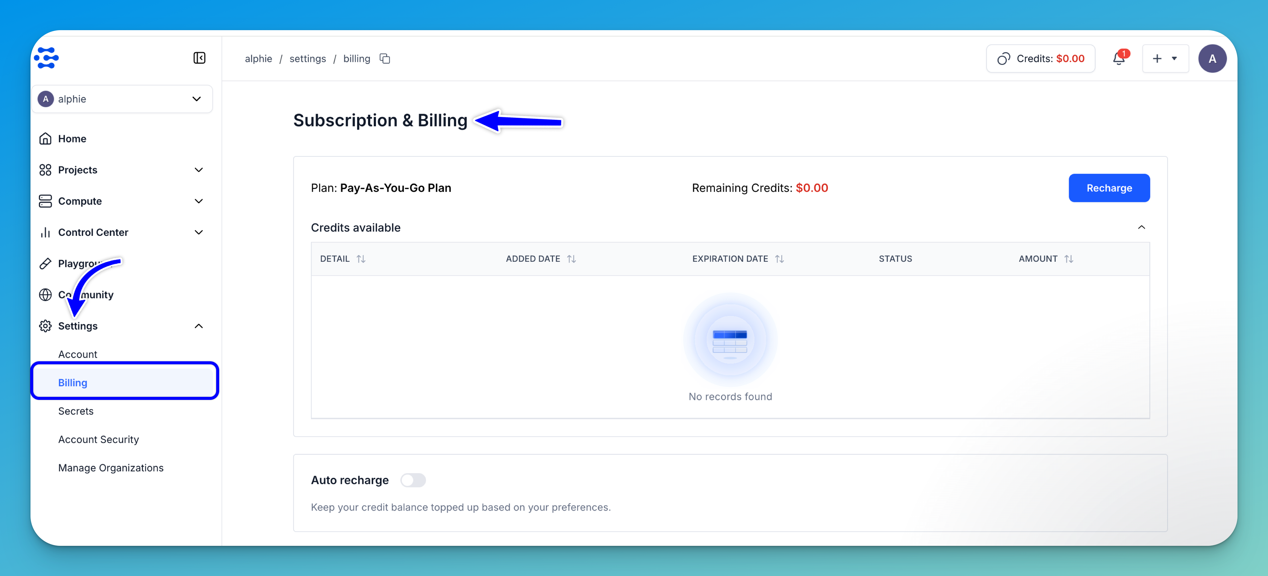The Subscription & Billing page provides a centralized place to view and manage your credits, plan, payment methods, and invoices.