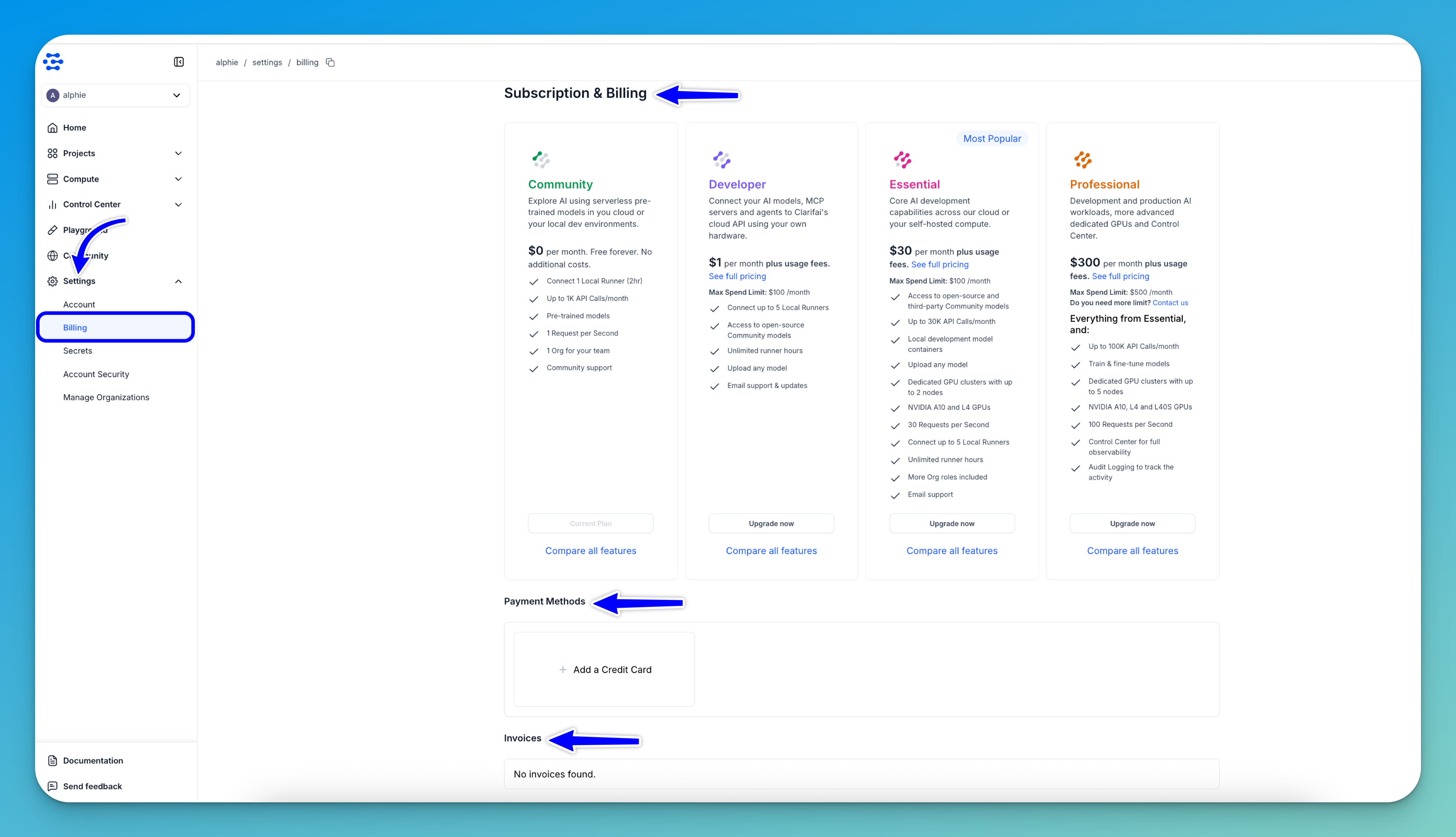 To access it, log in to the Clarifai platform. Then, in the collapsible left sidebar, select Settings and choose Billing from the dropdown list.