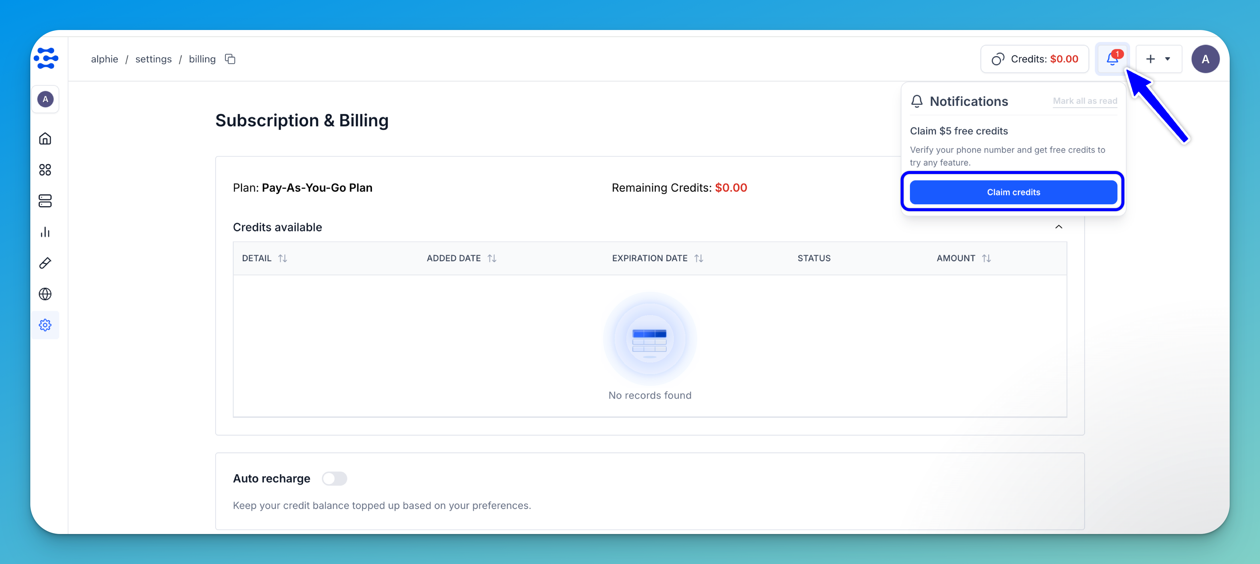After switching, click the notification bar and select Claim credits to verify your phone number and receive a one-time, free $5 credits, which can be used to try anything from serverless model access to dedicated deployments.