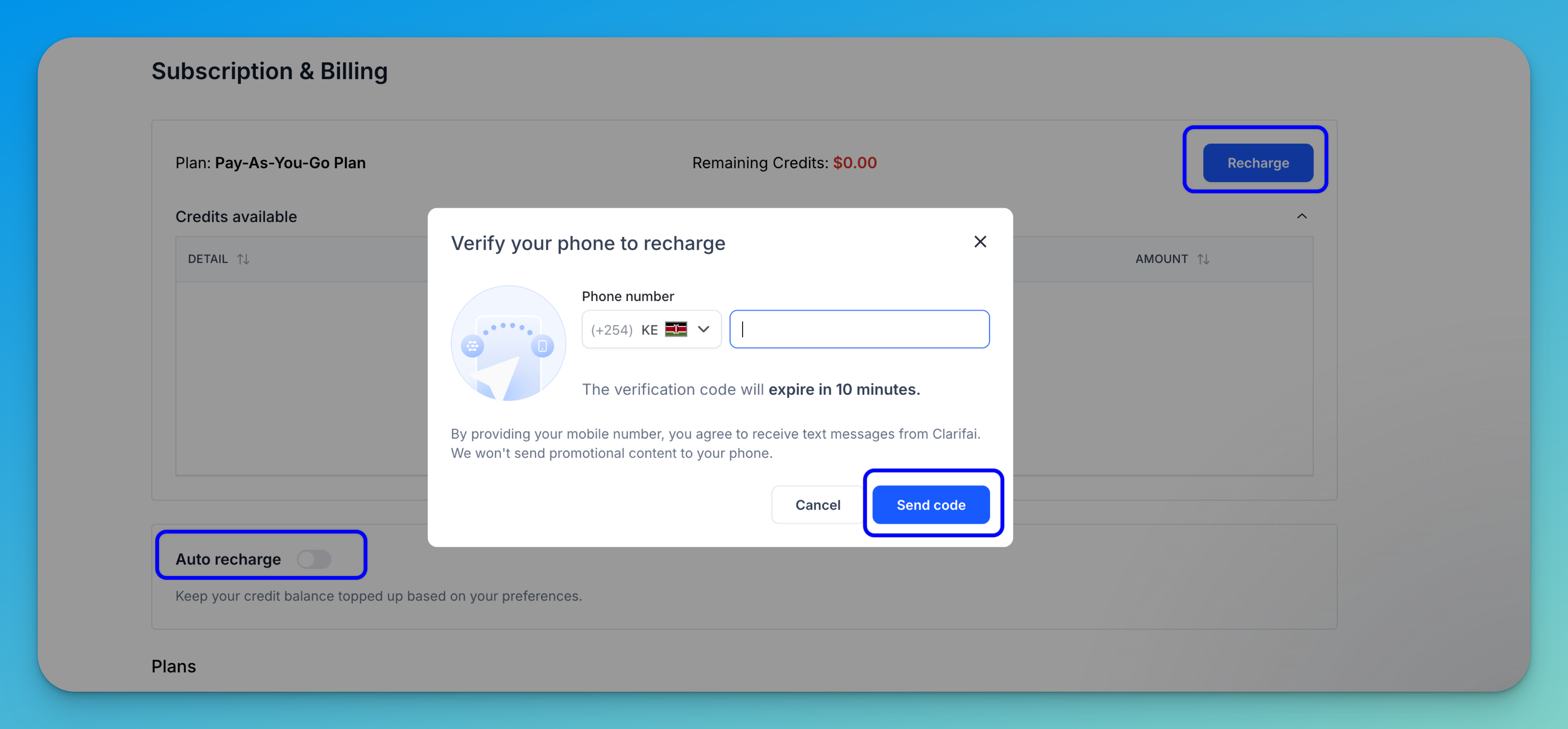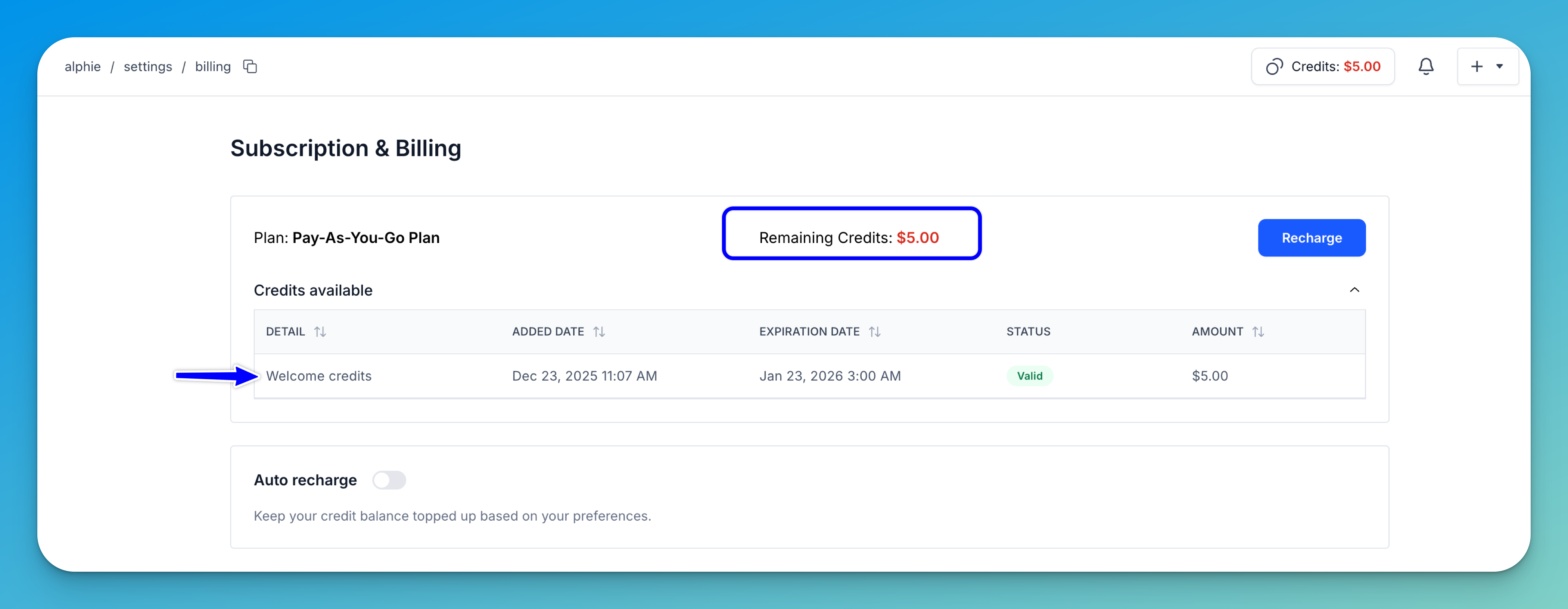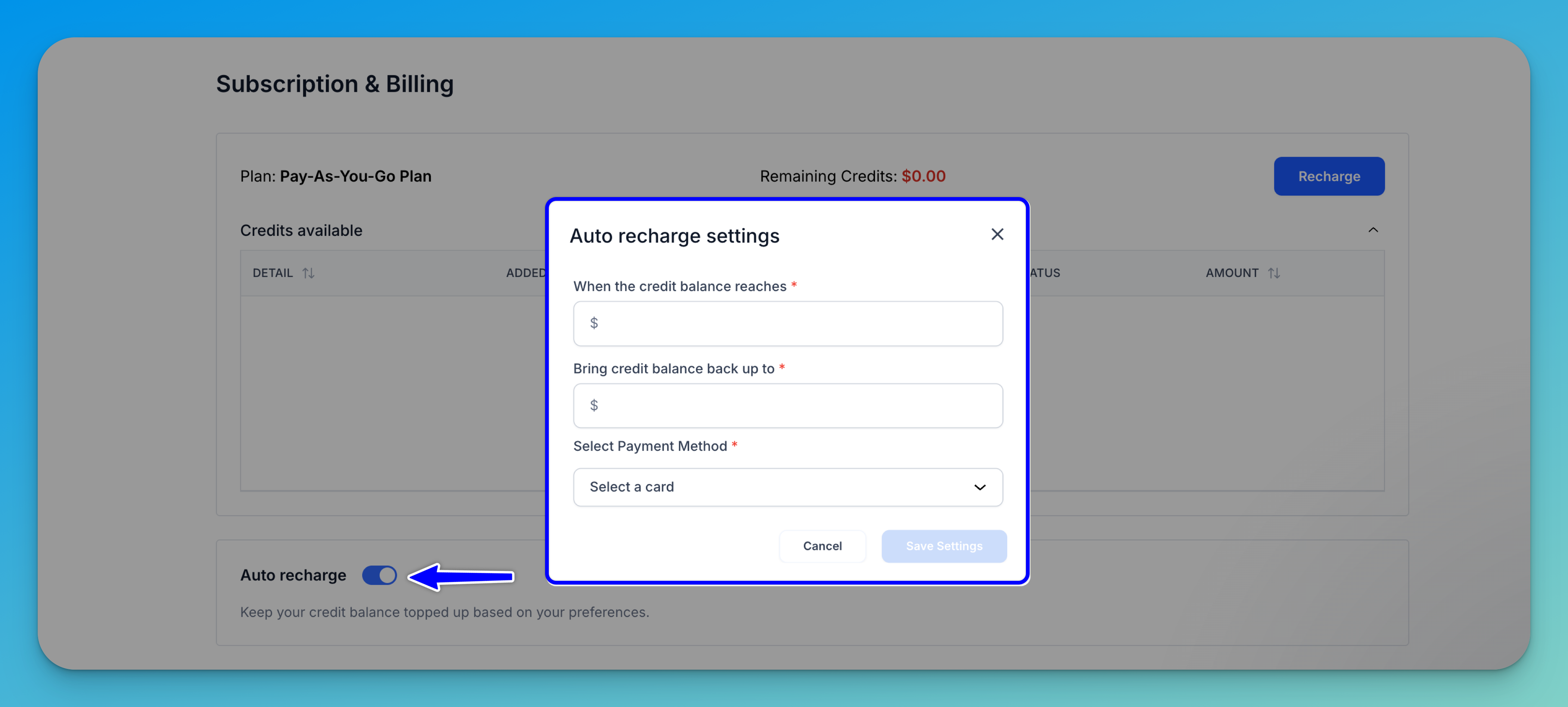 To enable automatic recharging, turn on the Auto recharge button. A dialog will appear where you can set a balance threshold — for example, when credits drop to $5, automatically recharge up to $20.
