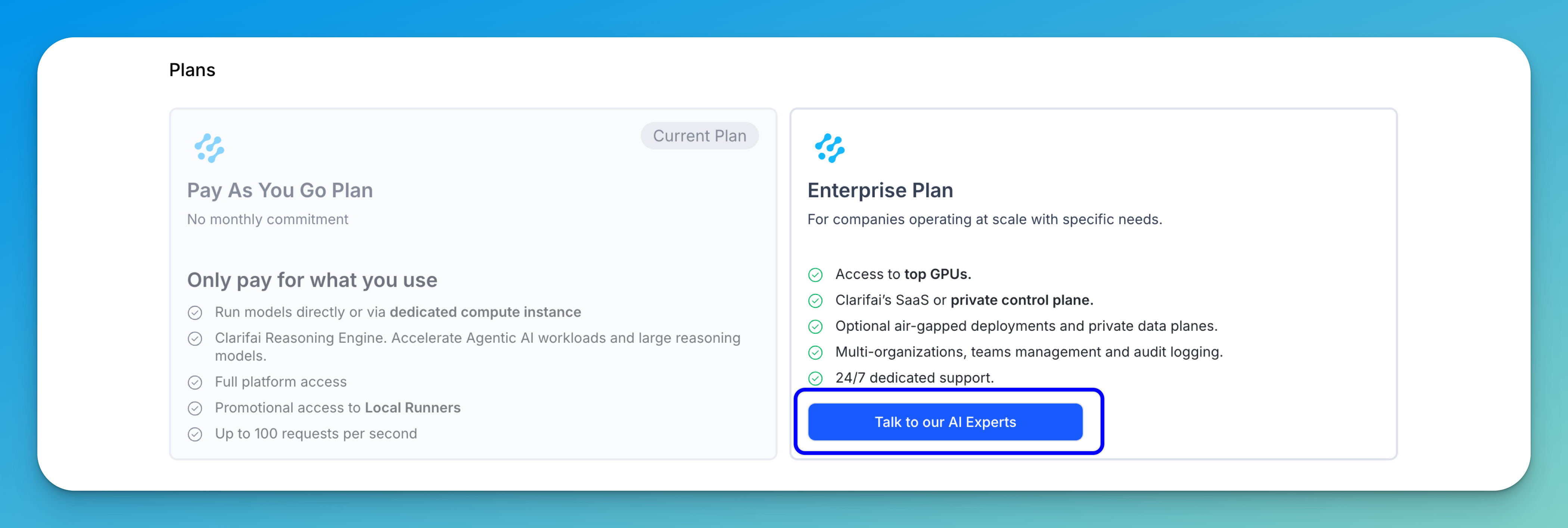 To upgrade to the Enterprise plan, click the Talk to our AI Experts button. You’ll be redirected to a page where you can schedule a meeting with our AI team to discuss your specific needs.