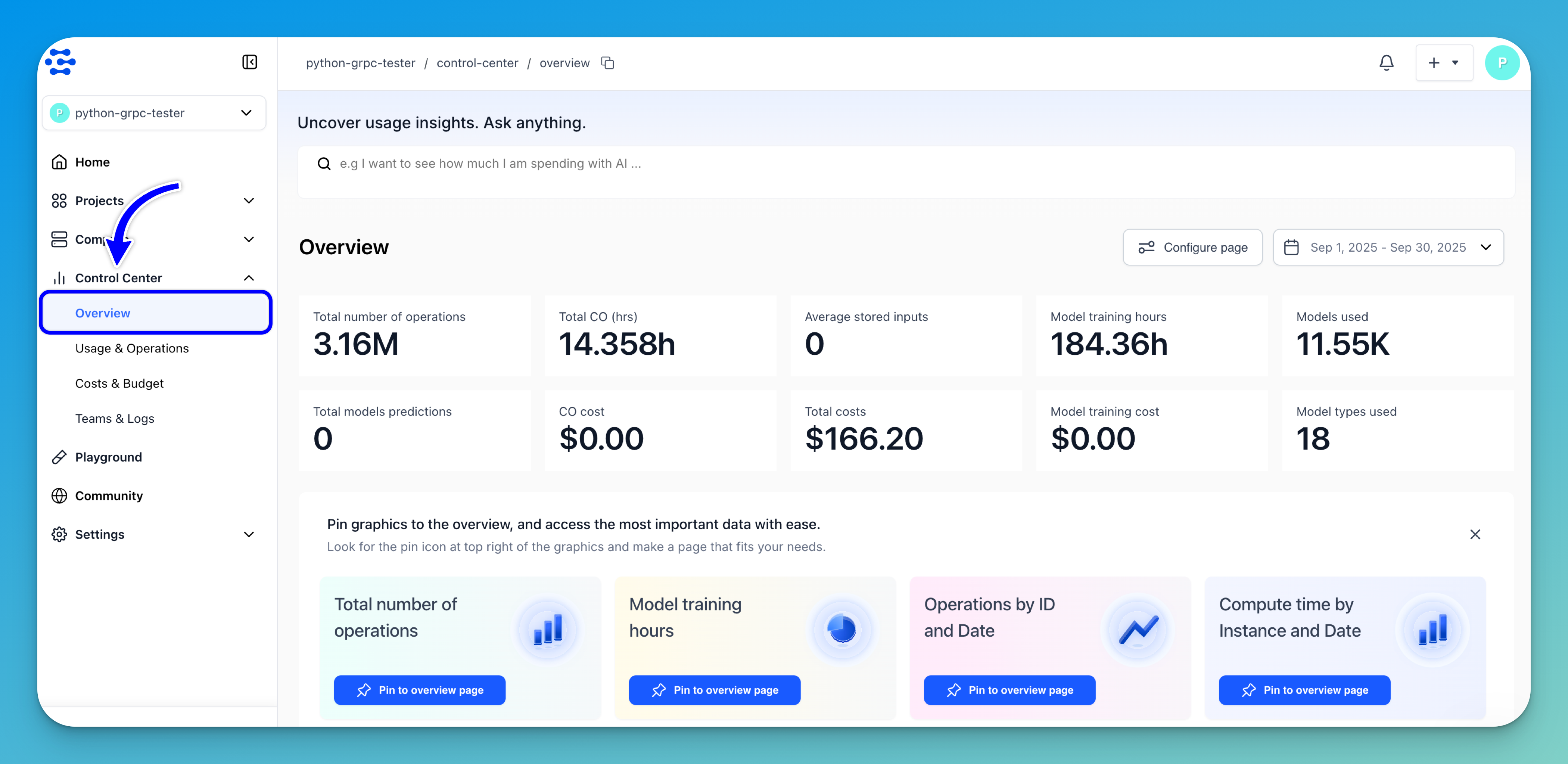 To access the Control Center, log in to Clarifai’s platform. Then, in the collapsible left sidebar, select Control Center and choose Overview from the dropdown list.