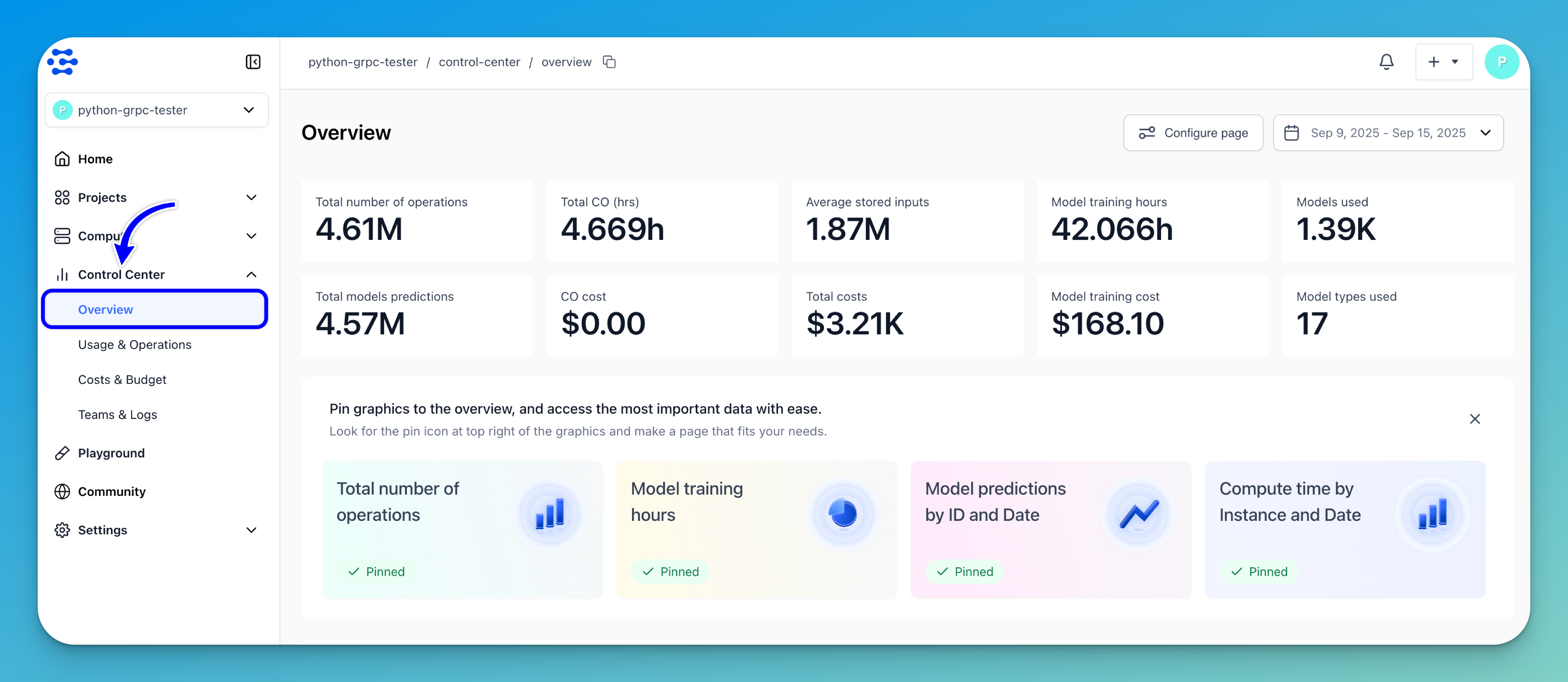 To access the Control Center, log in to Clarifai’s platform. Then, in the collapsible left sidebar, select Control Center and choose Overview from the dropdown list.