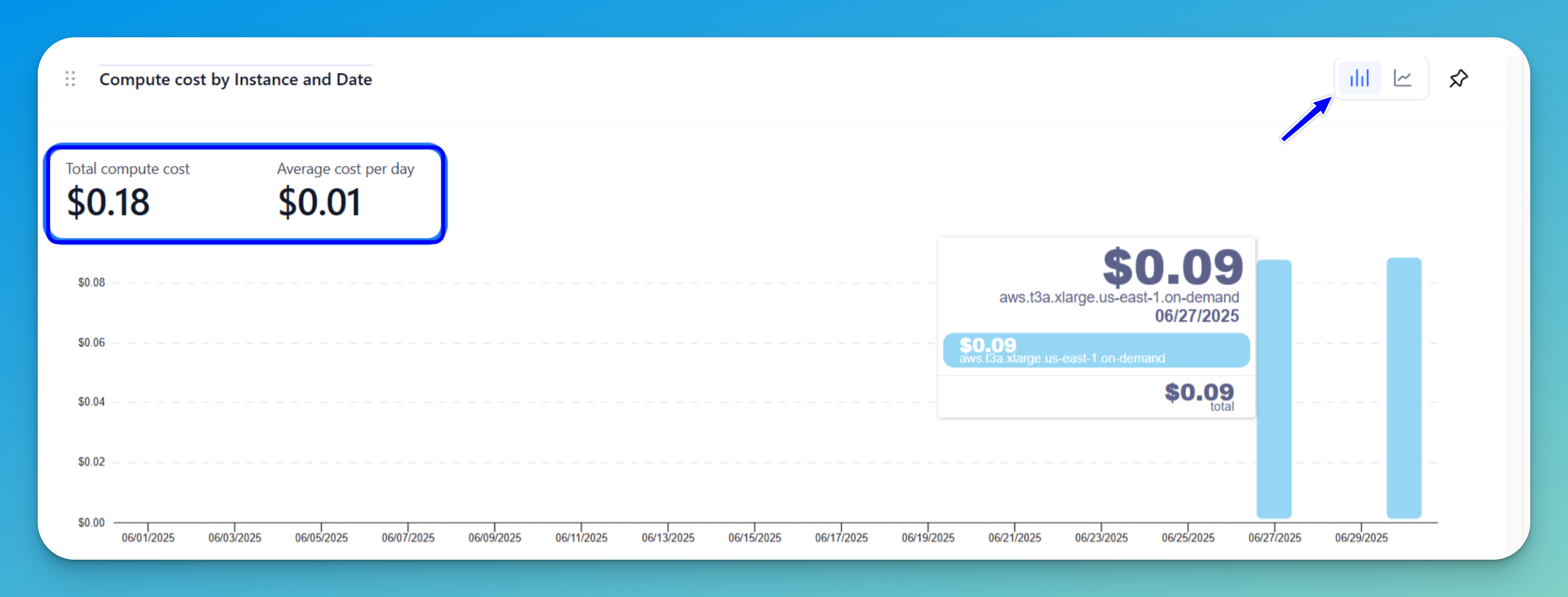 This section displays the total compute cost for instance types, as well as the average daily cost, during the selected time period.