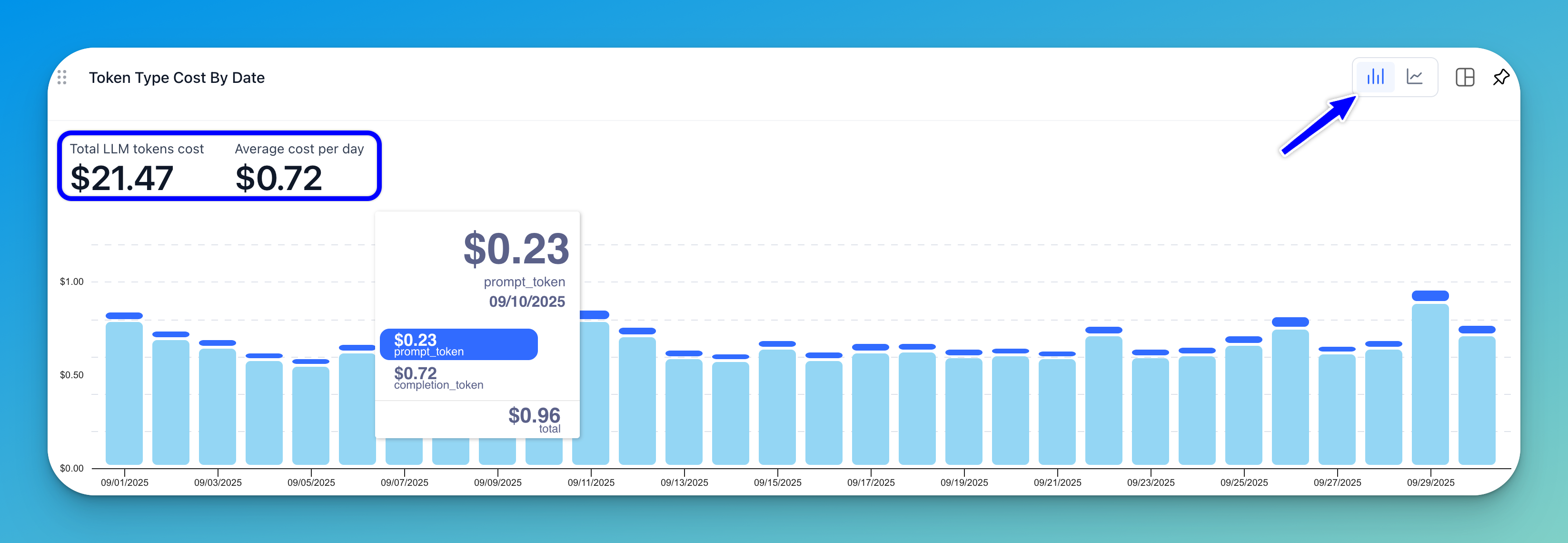 This section displays the total cost of all your LLM tokens, along with the average daily cost, during the selected time period.