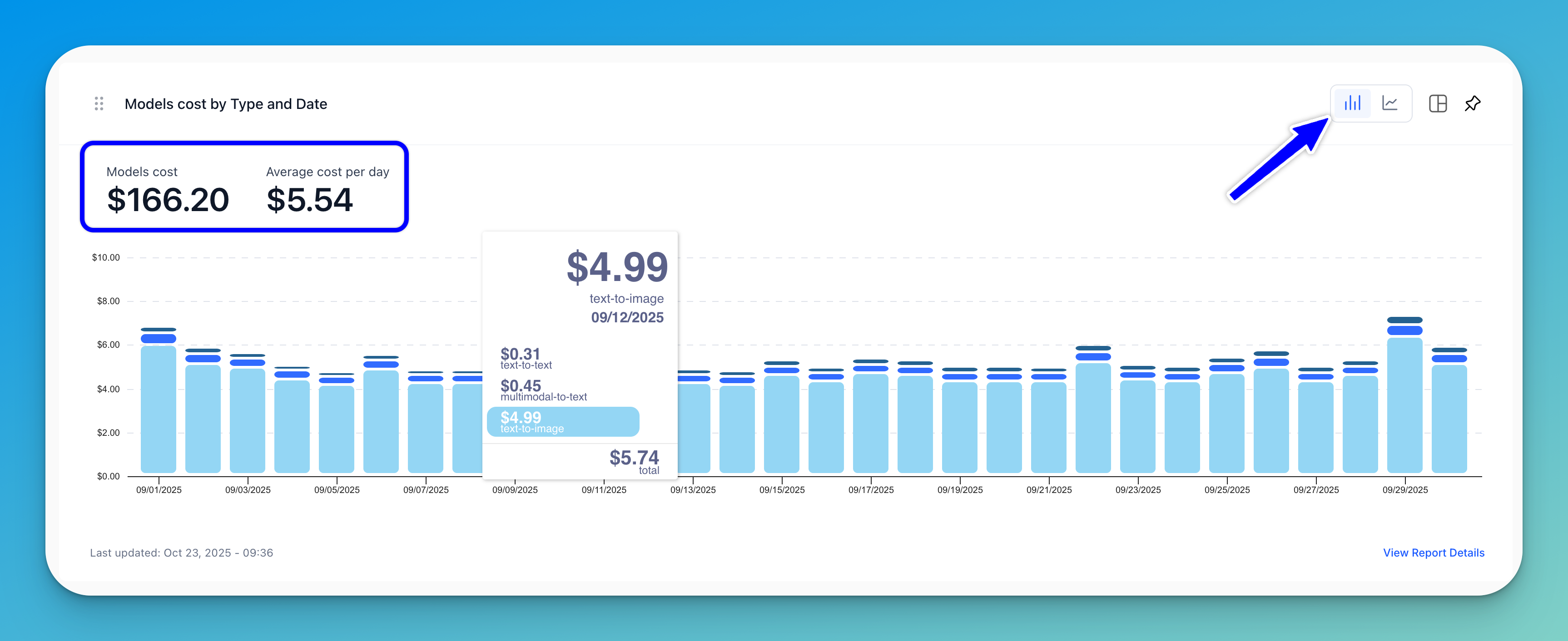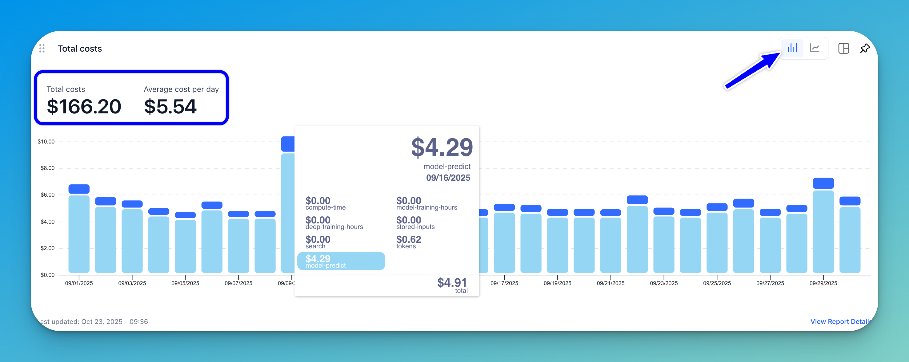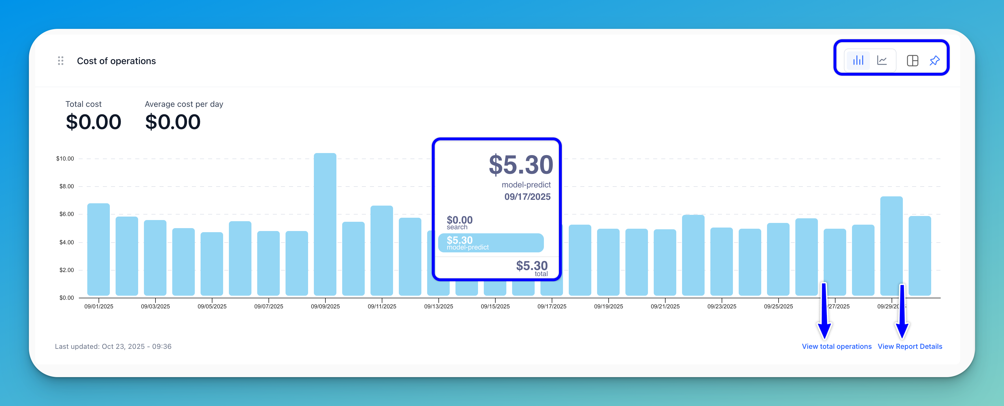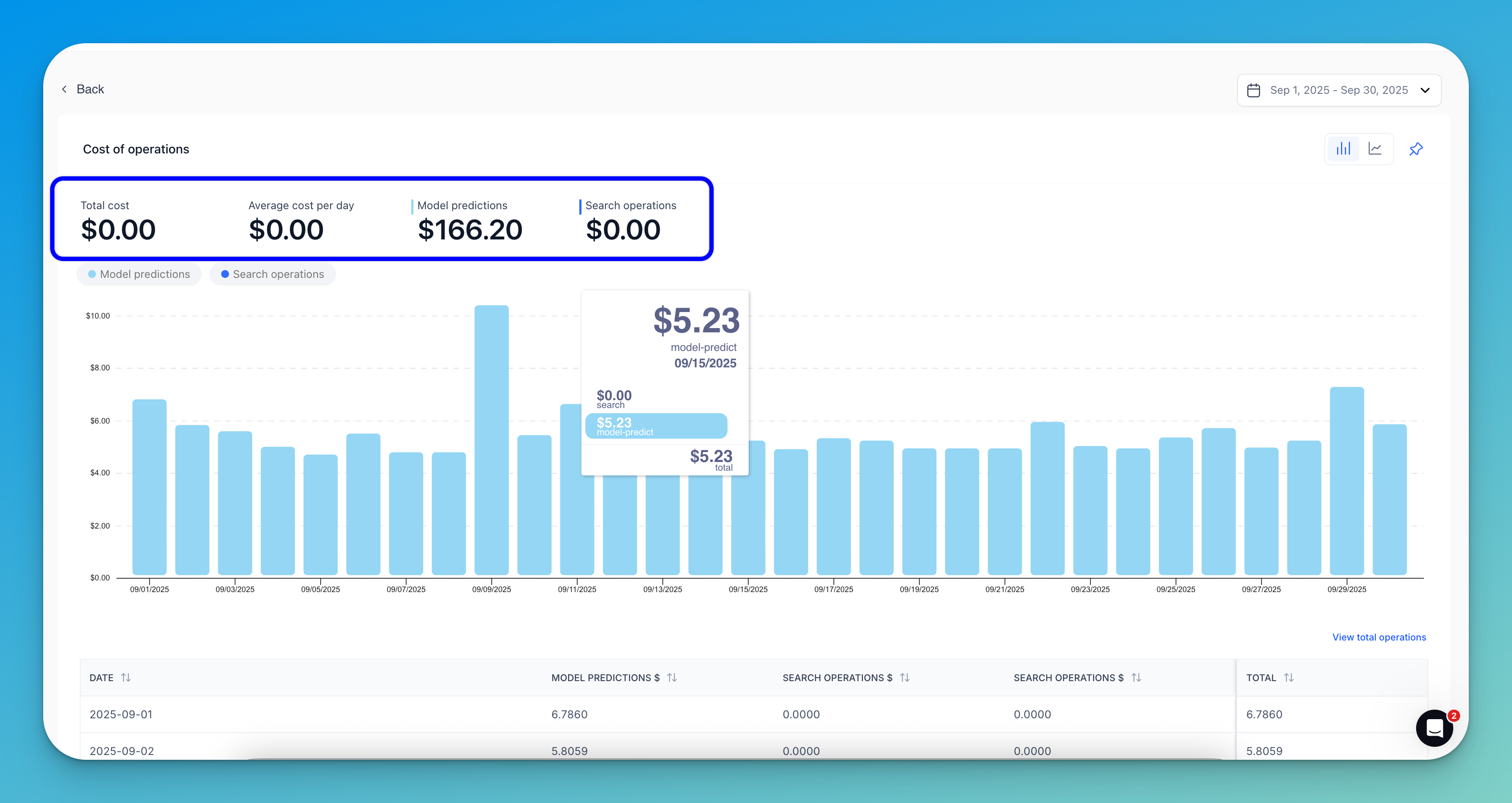 This section displays the total cost of all your model predictions, along with the average daily cost, during the selected time period.