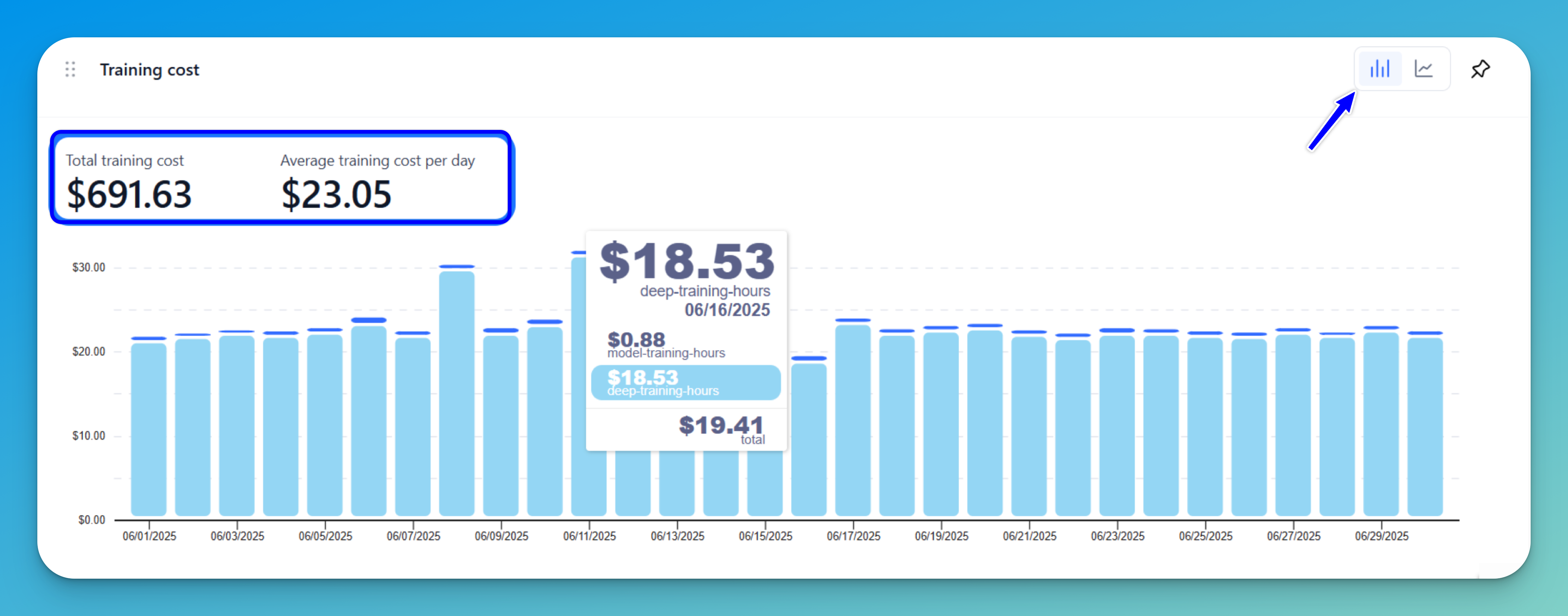 This section displays the total cost of training your deep training and transfer learning models, along with the average daily cost, during the selected time period.