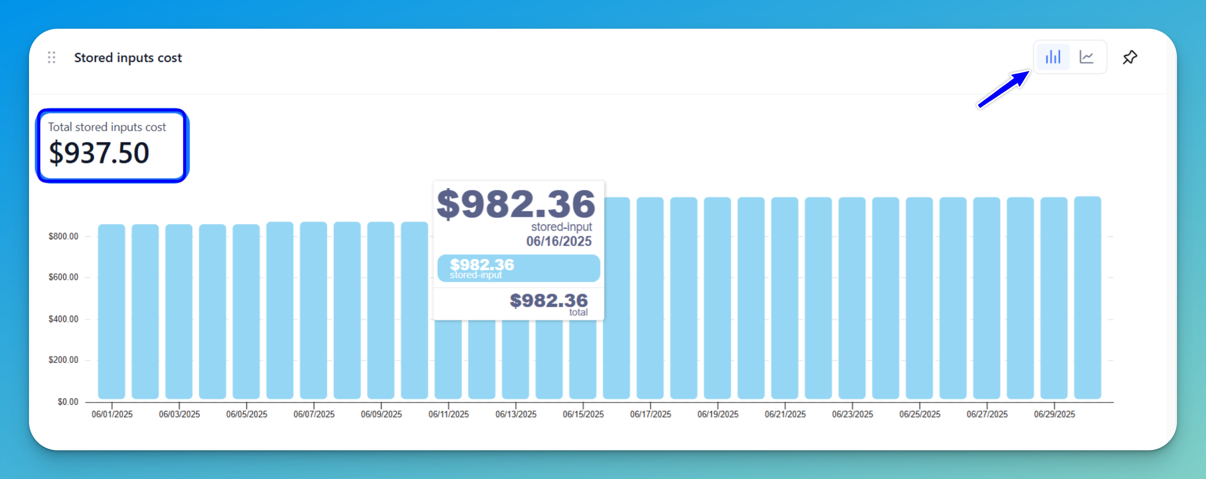 This section displays the total cost of storing inputs on our platform during the selected time period.