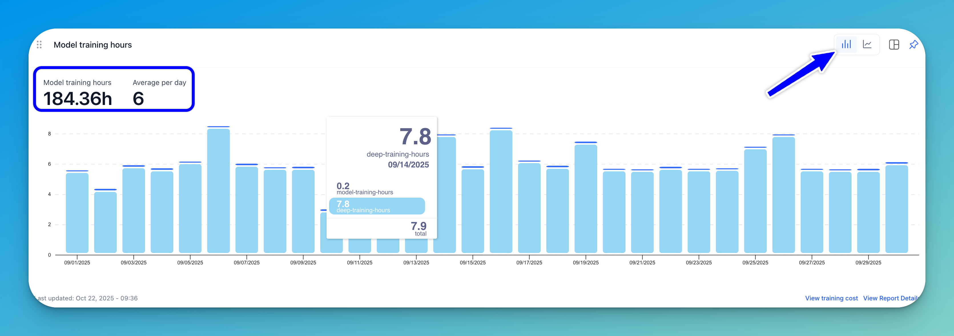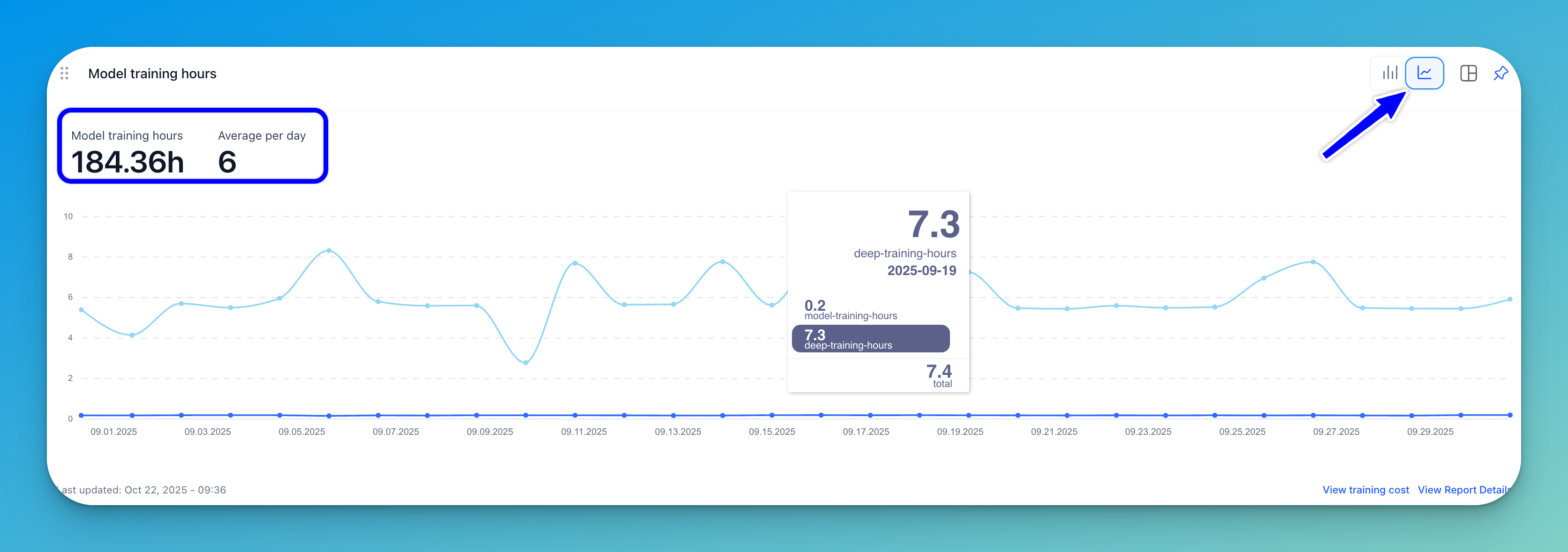 A stacked bar chart (displayed by default) or a line graph shows the number of training hours for each type of model plotted against specific dates.