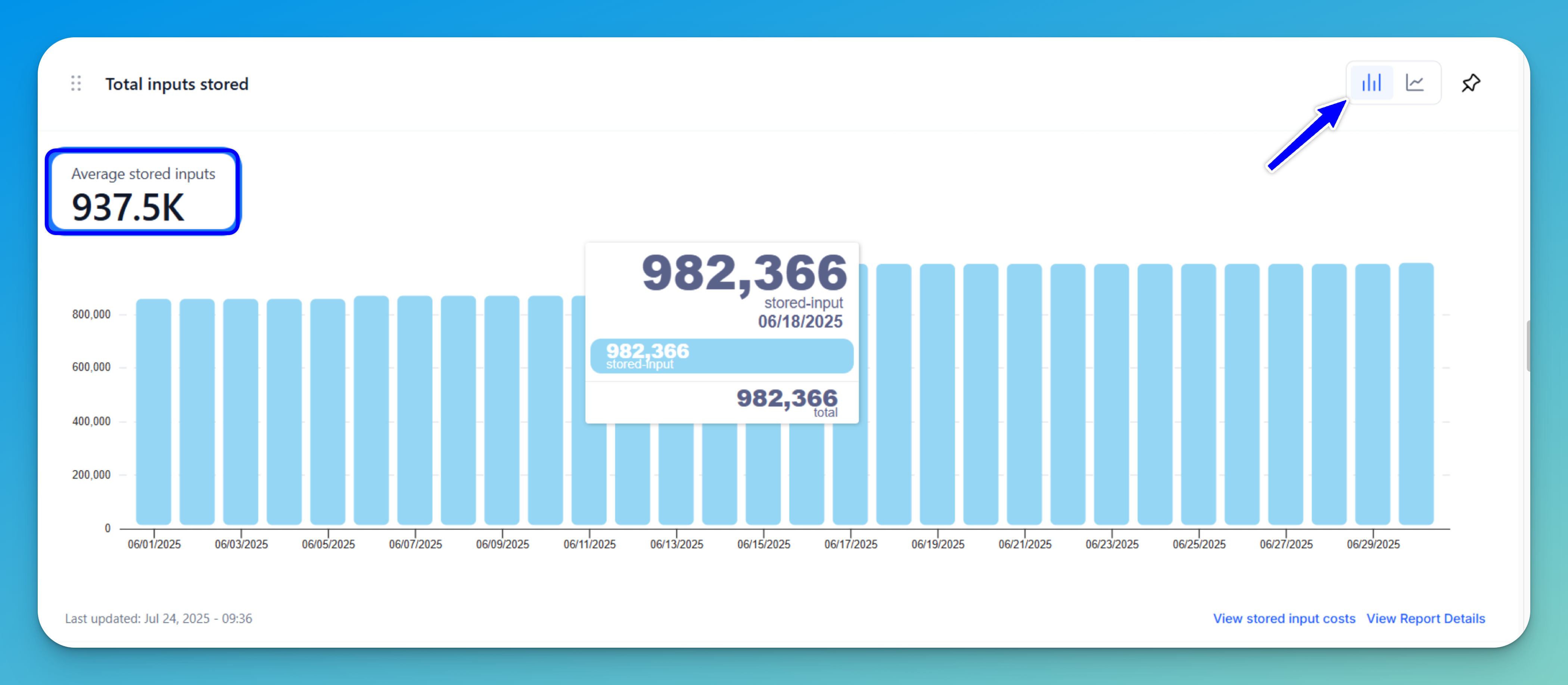 A bar chart (displayed by default) or a line graph shows the number of inputs plotted against specific dates.