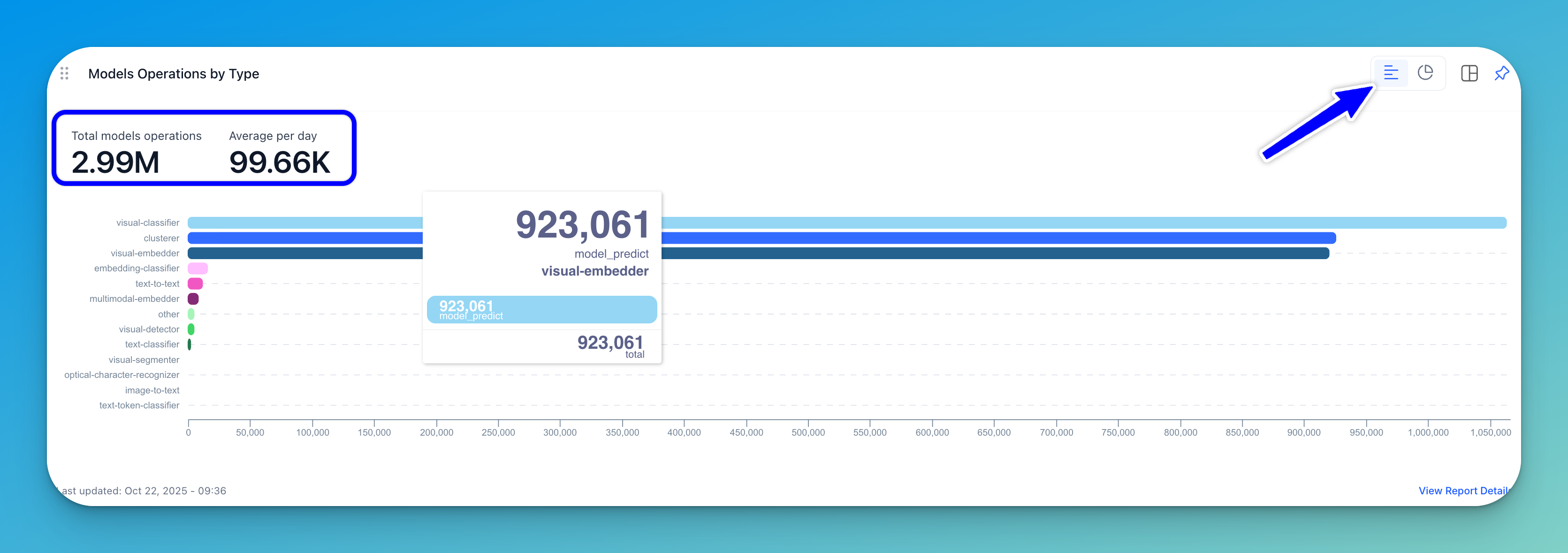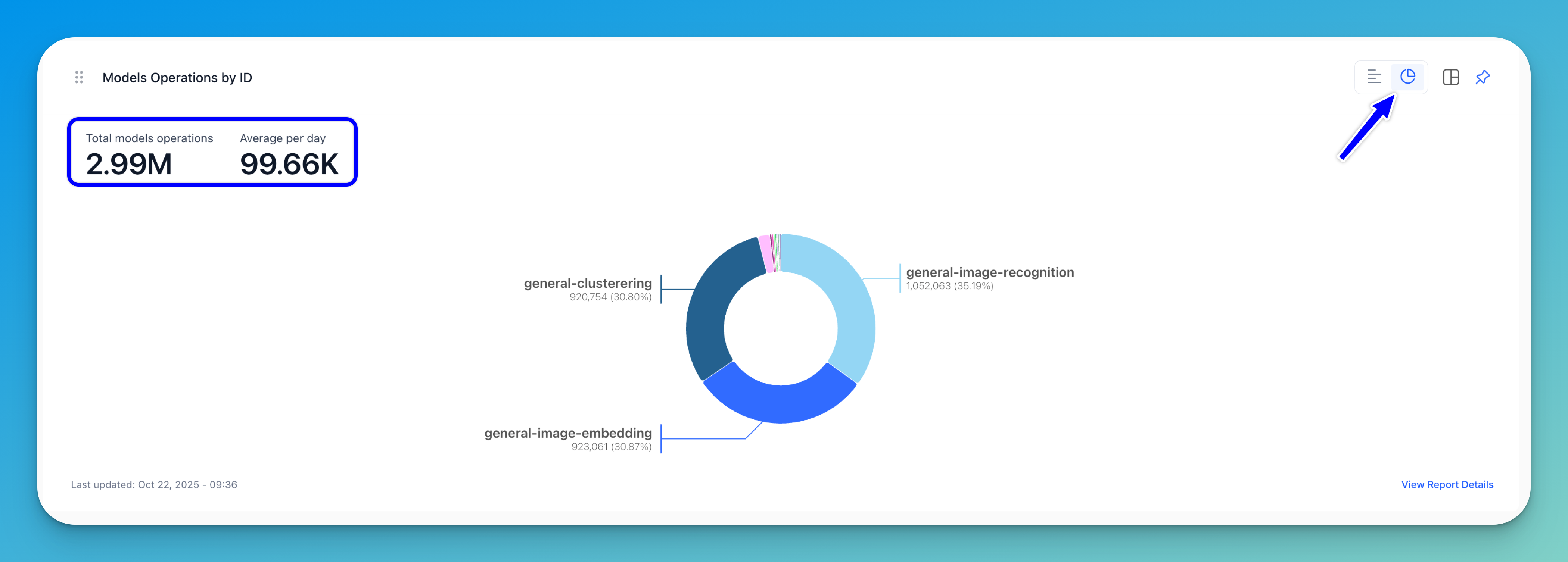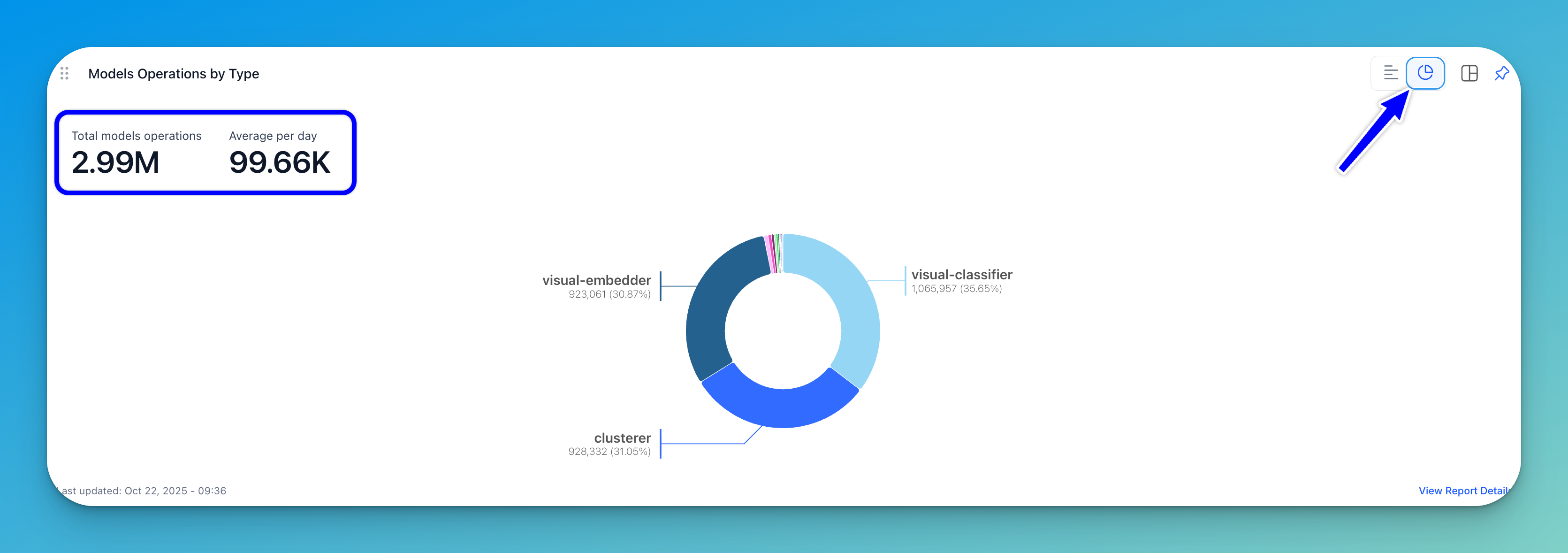 A bar chart (displayed by default) shows the type of models plotted against the number of operations. In a donut chart, the number of models operations is visualized and grouped by type.