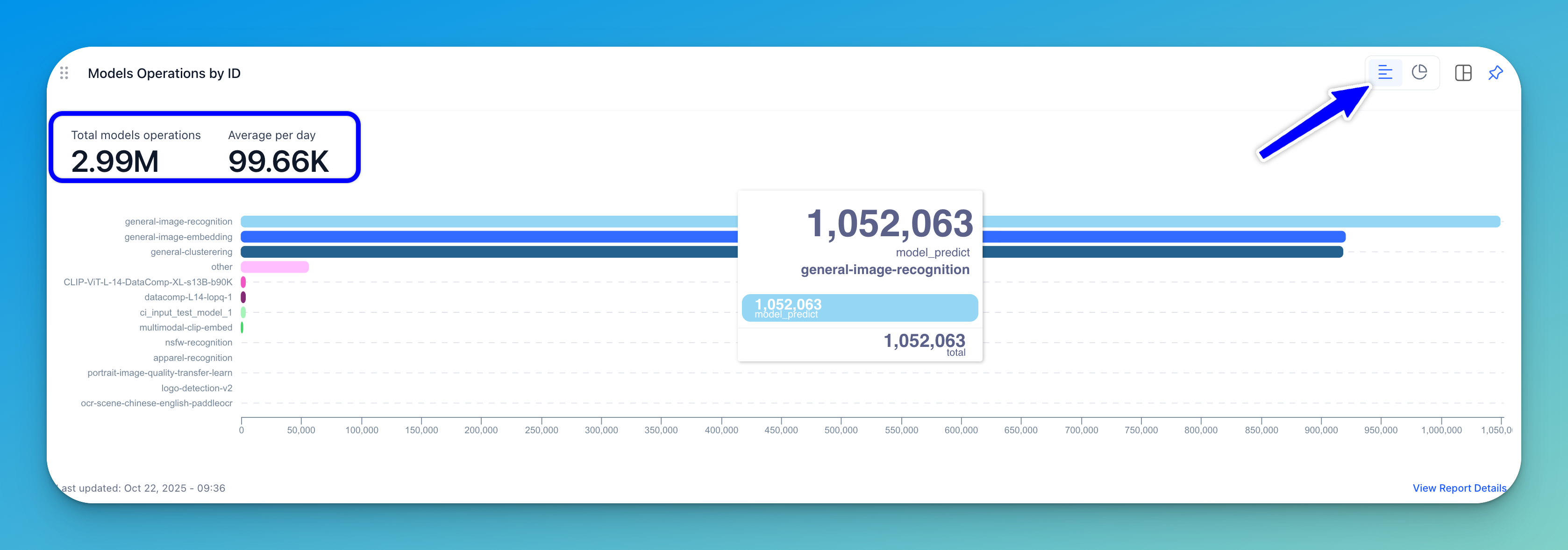 This section displays the total number of model operations, and the daily average, for the selected time period. It shows the operations by unique model ID.