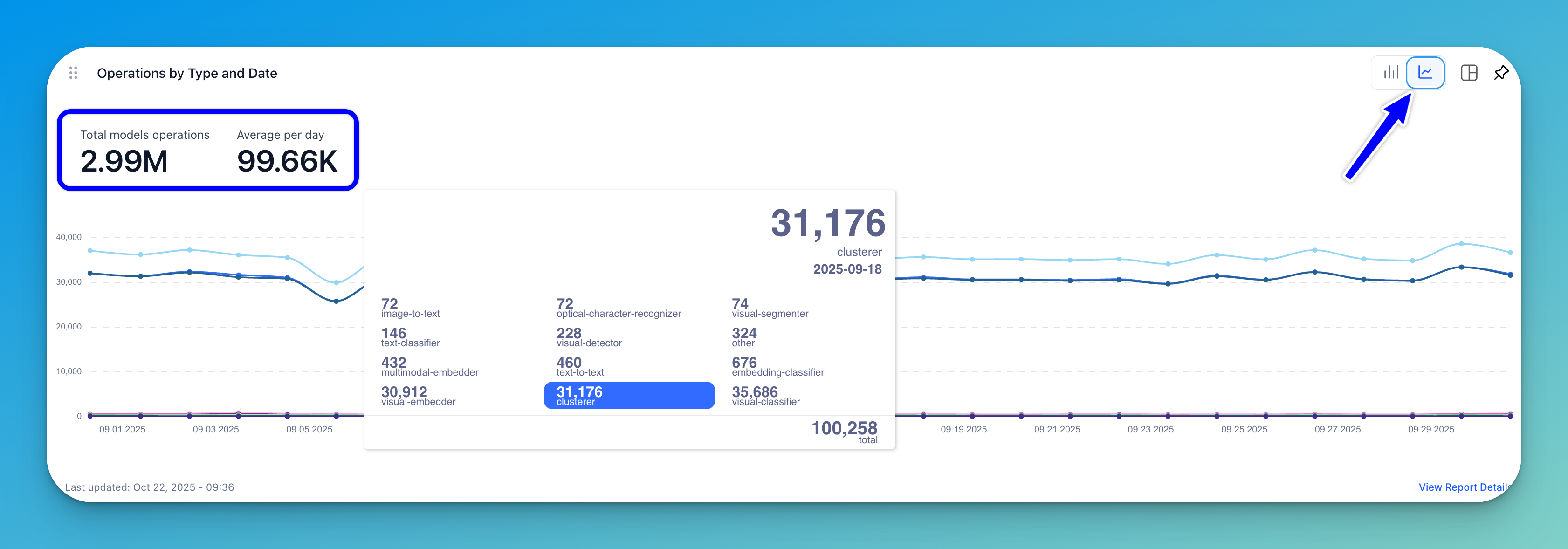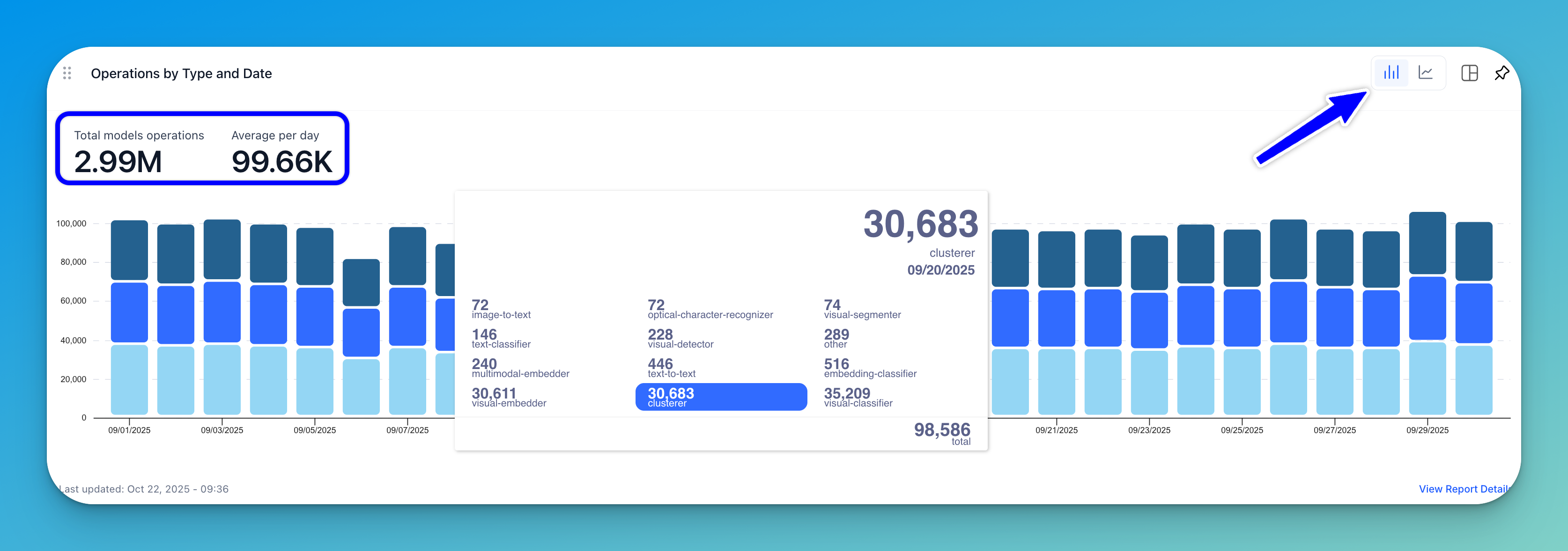 A stacked bar chart (displayed by default) or a line graph shows the number of operations by model type plotted against specific dates.