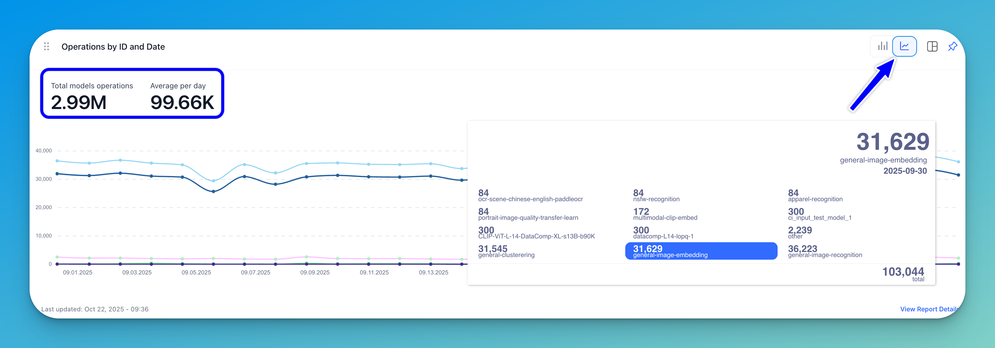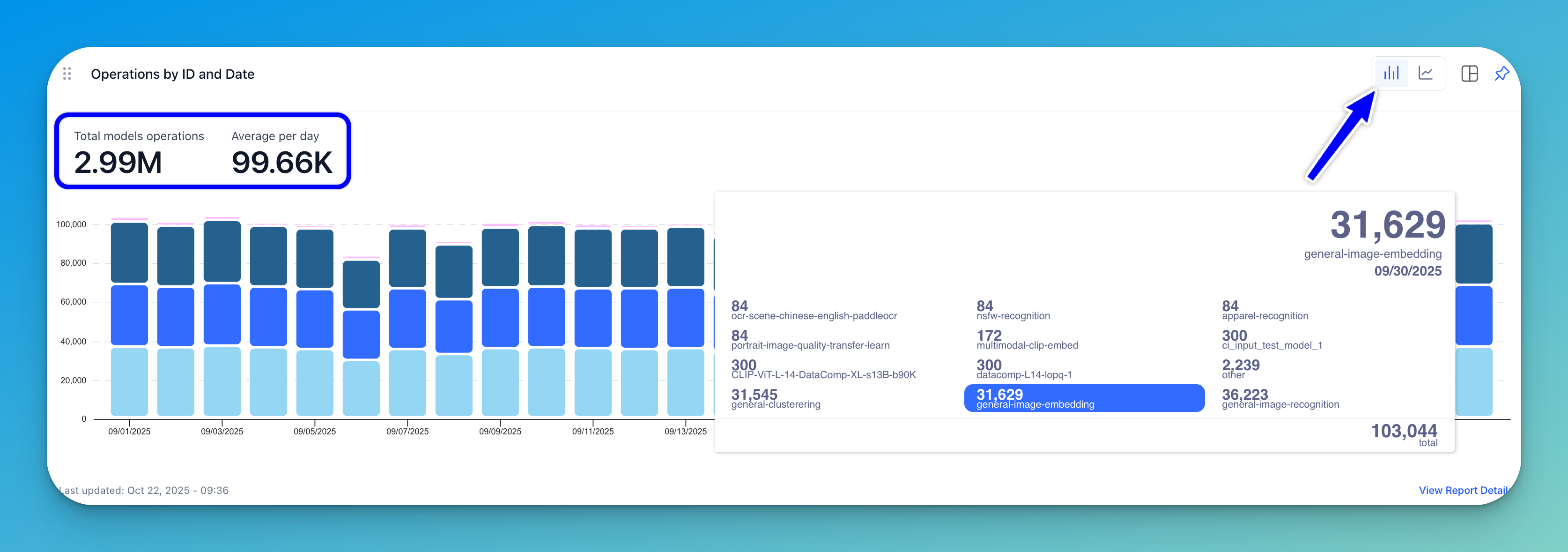 A stacked bar chart (displayed by default) or a line graph shows the number of operations by model ID plotted against specific dates.