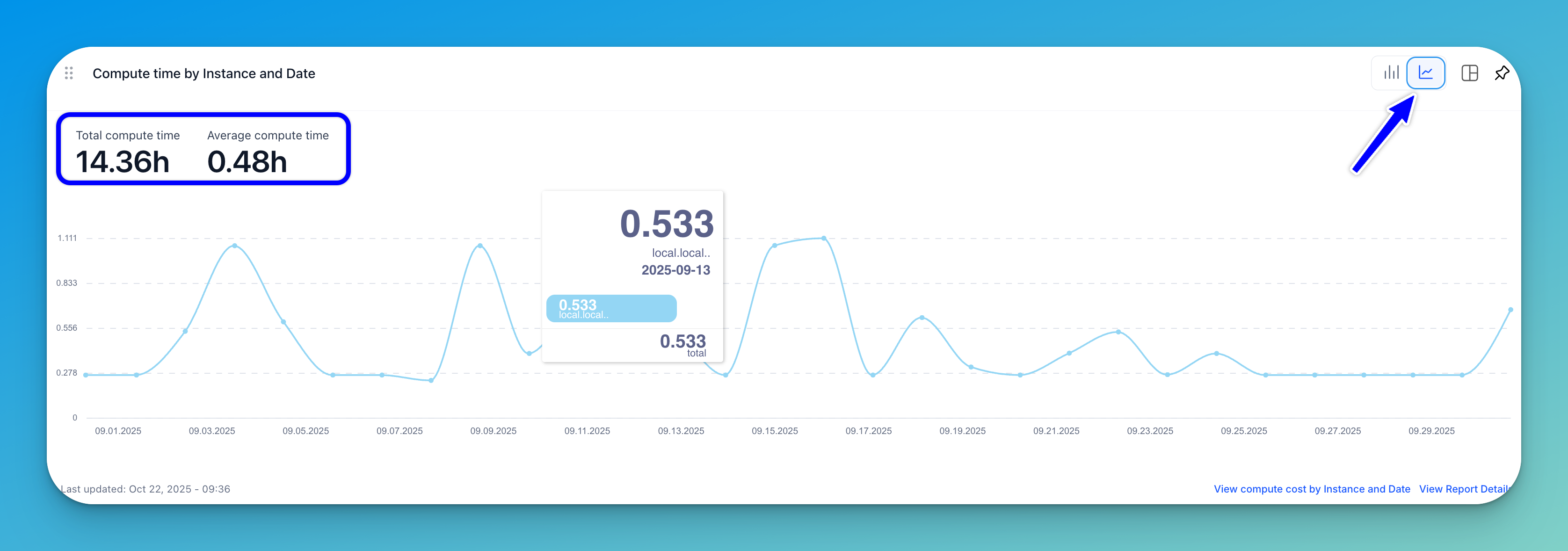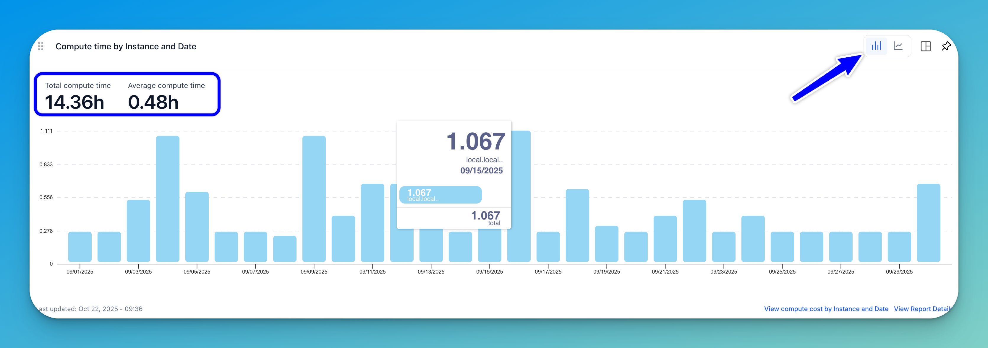 A stacked bar chart (displayed by default) or a line graph shows the number of compute hours per instance type across specific dates.
