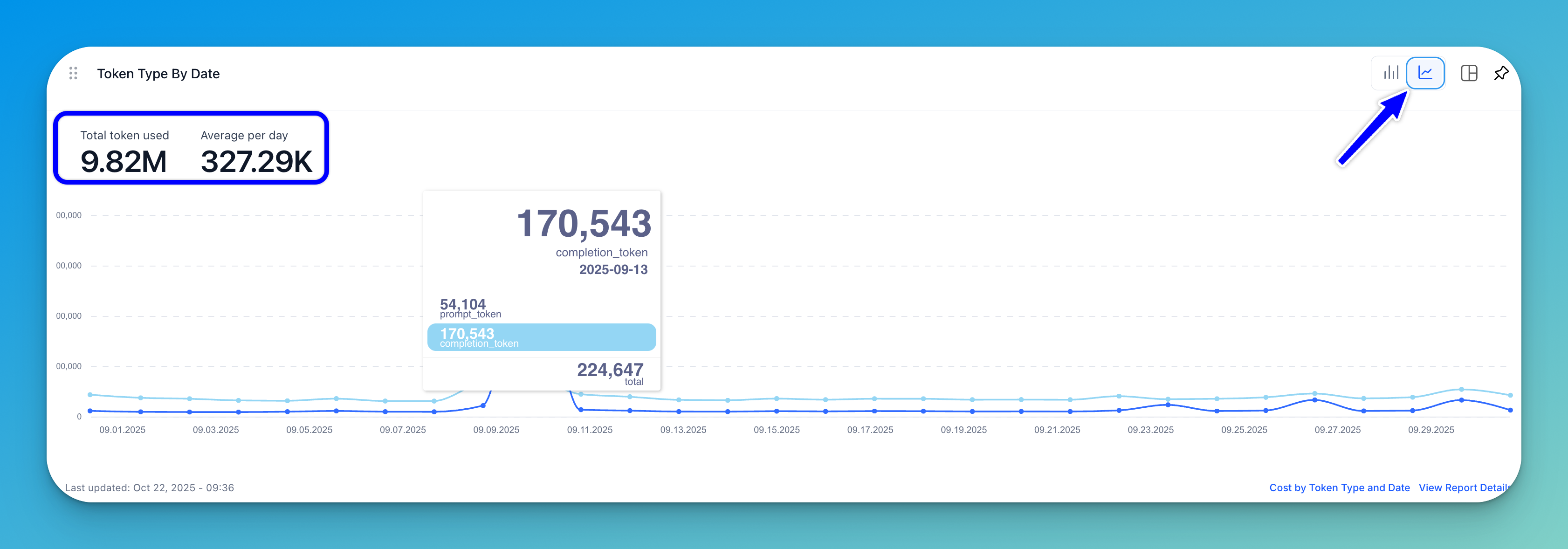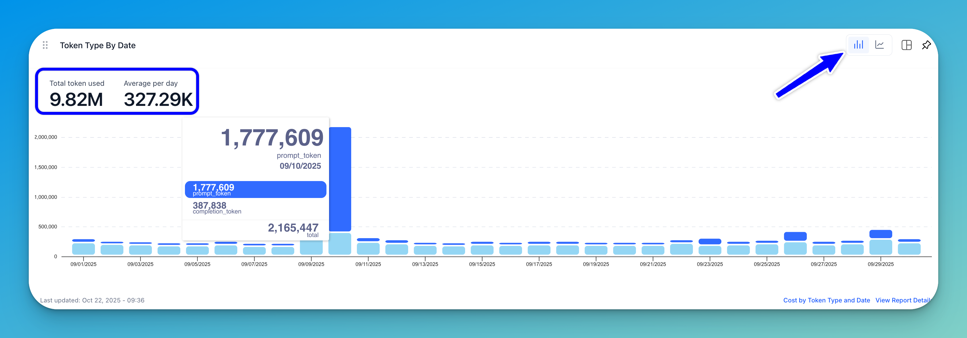 A stacked bar chart (displayed by default) or a line graph shows the number of tokens plotted against specific dates. Each bar represents the total tokens used per day, segmented by token type, such as prompt_token and completion_token.