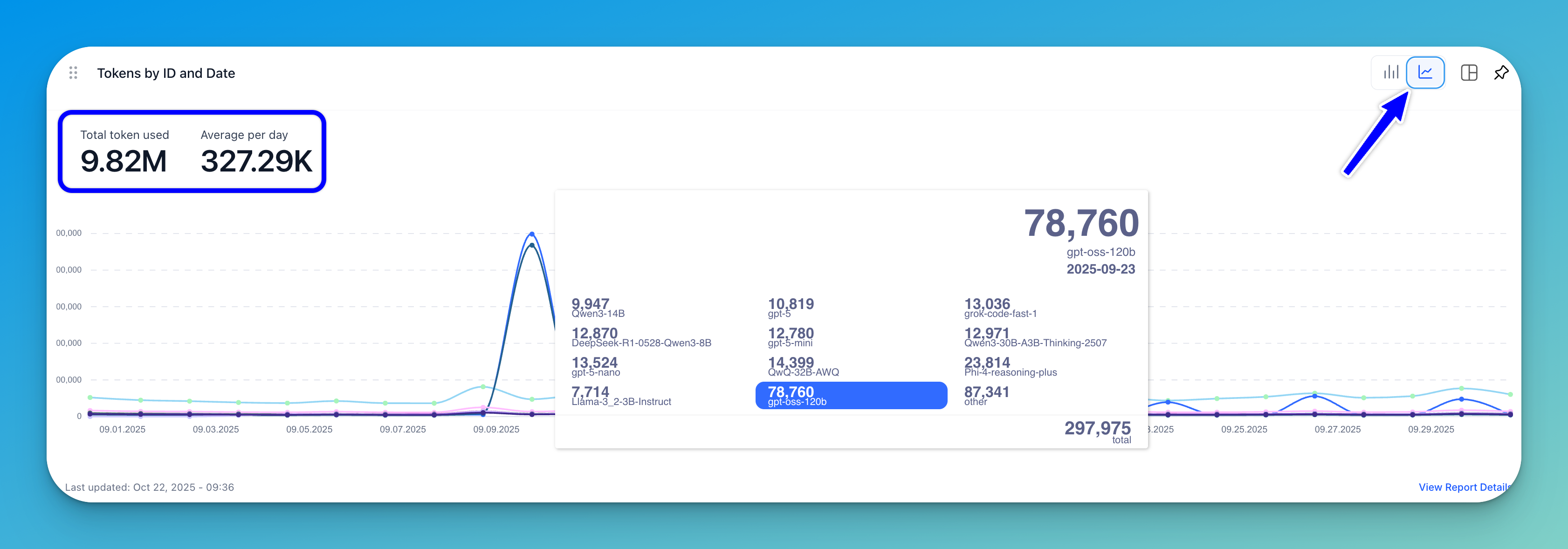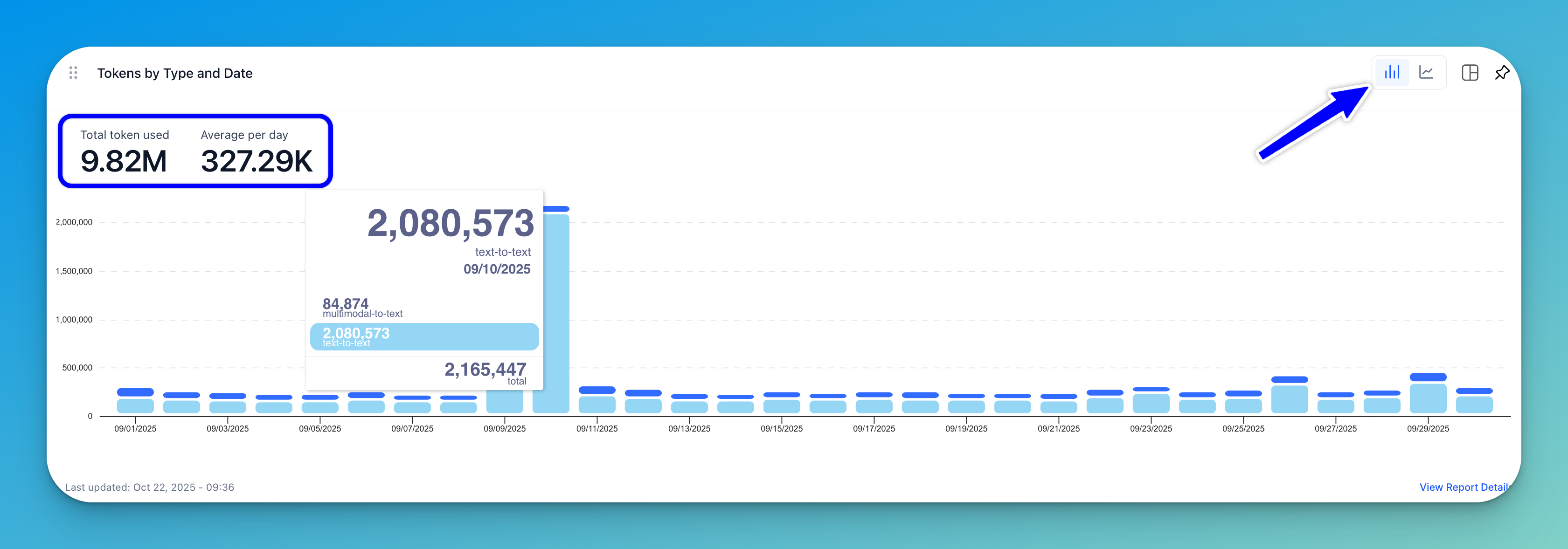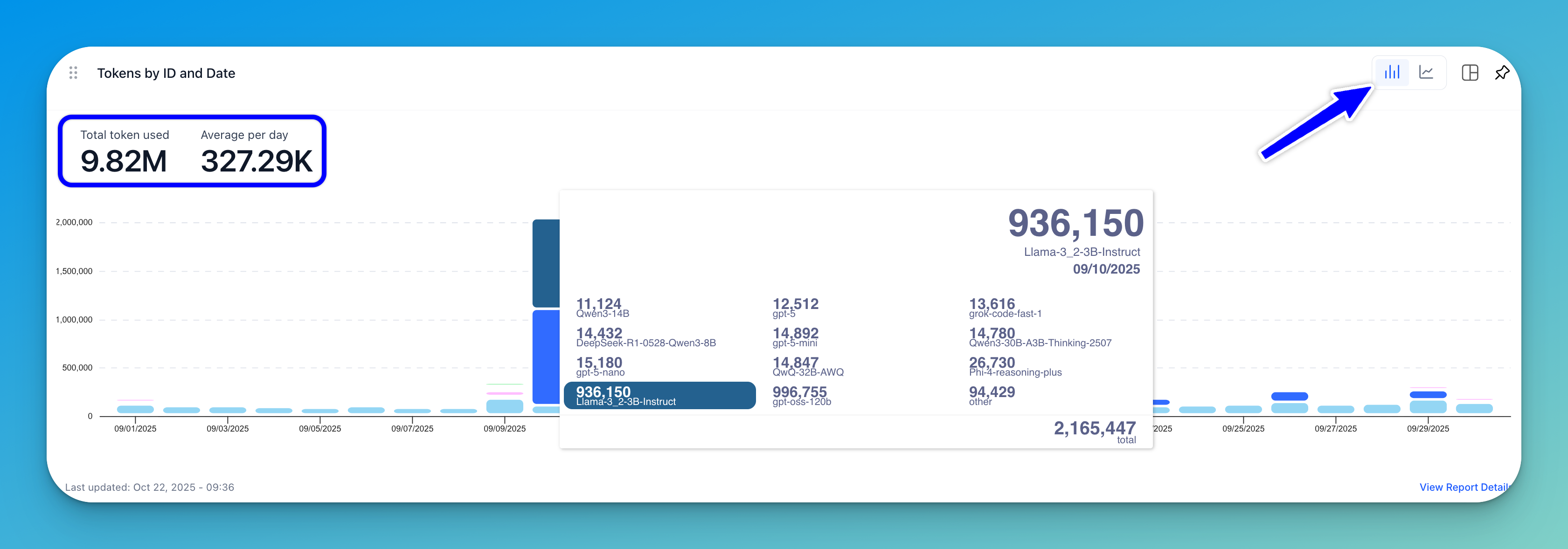 A stacked bar chart (displayed by default) or a line graph shows the number of tokens consumed across specific dates. Each bar represents the total tokens used per day, segmented by model ID.