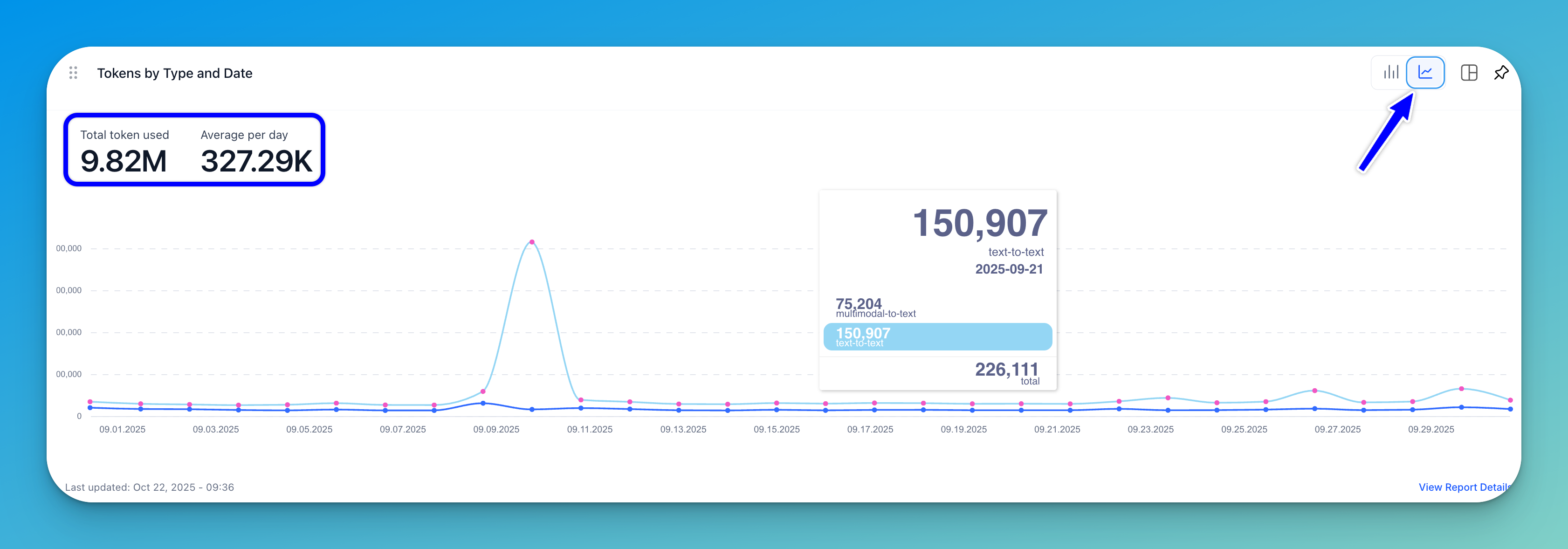 This section displays the total number of tokens used, and the daily average, for the selected time period, broken down by token type.