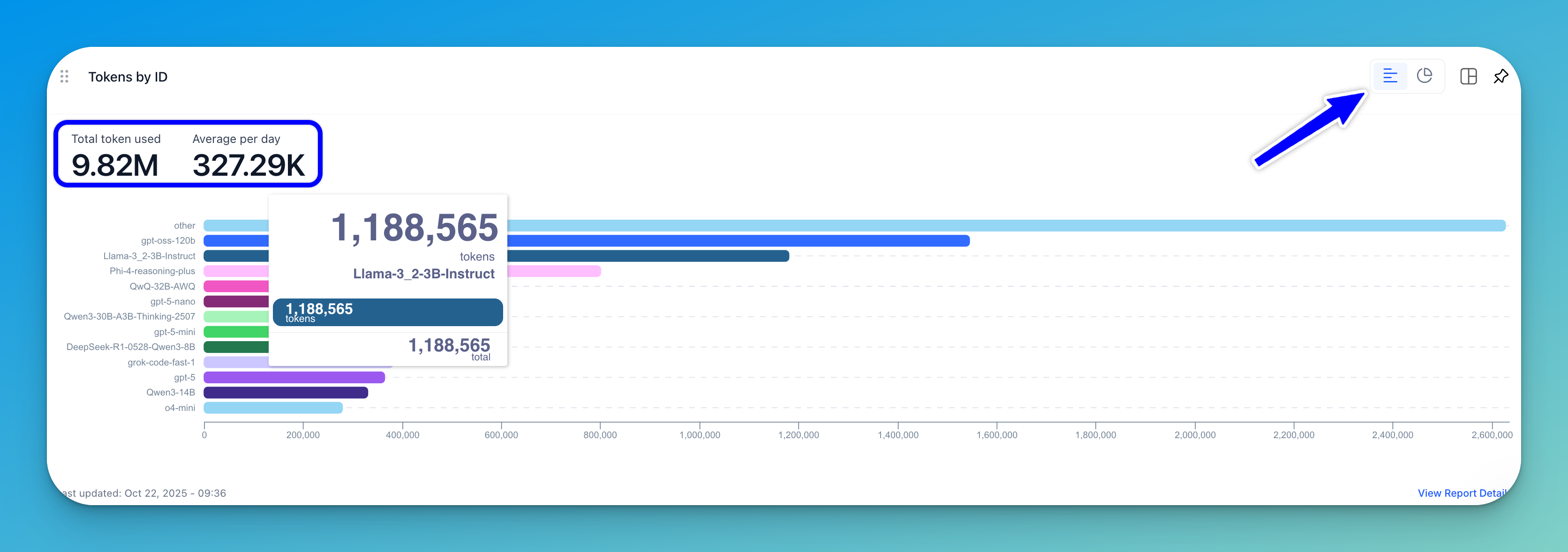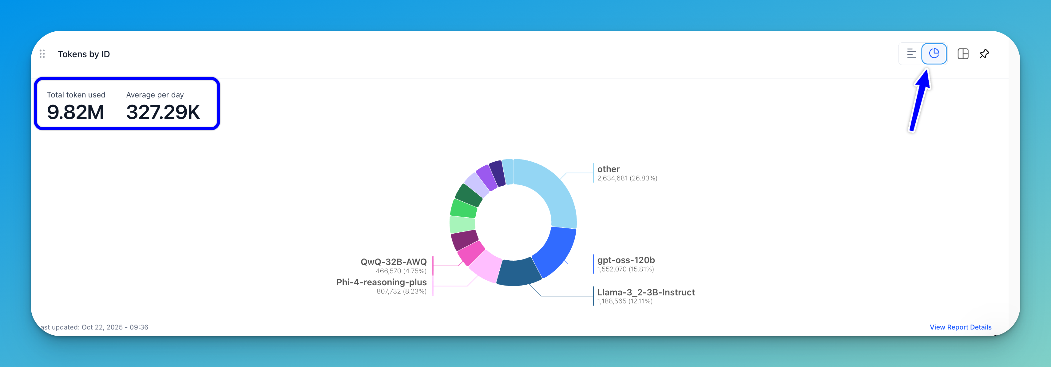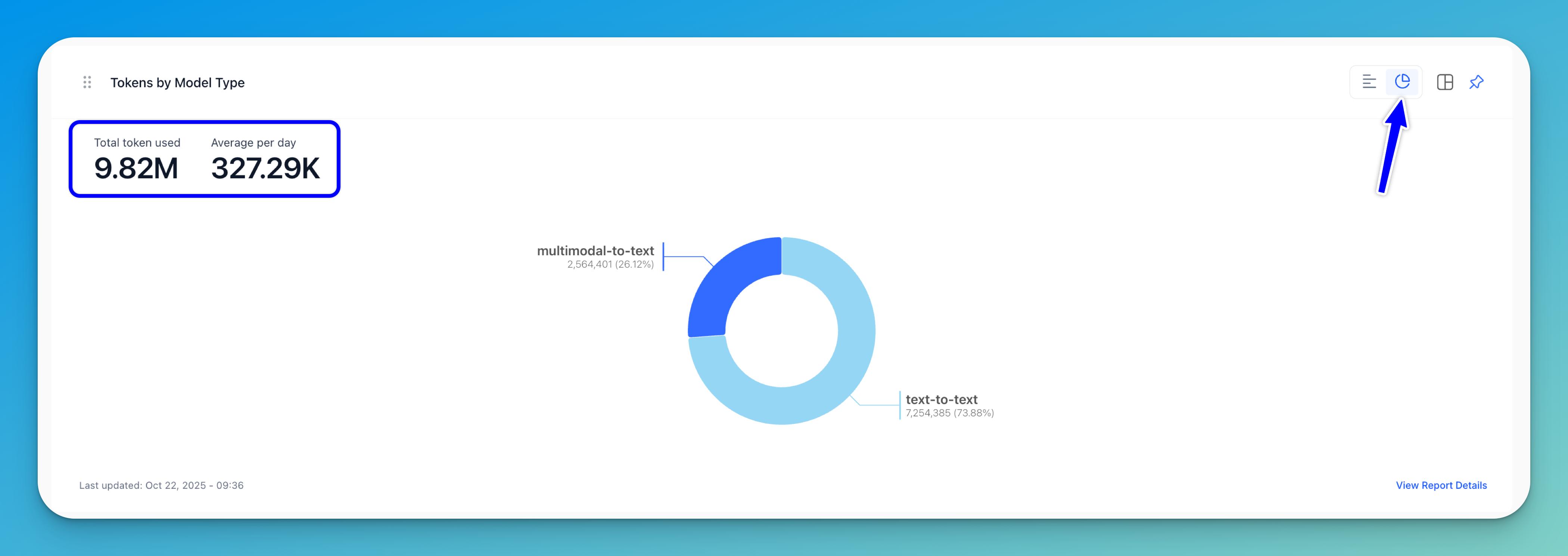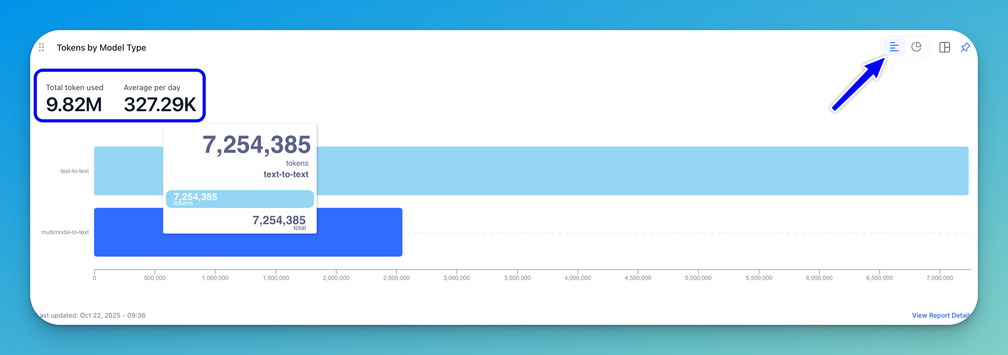 A horizontal bar chart (displayed by default) compares token usage across different model types. In a donut chart, the number of tokens consumed is visualized and grouped by model type.