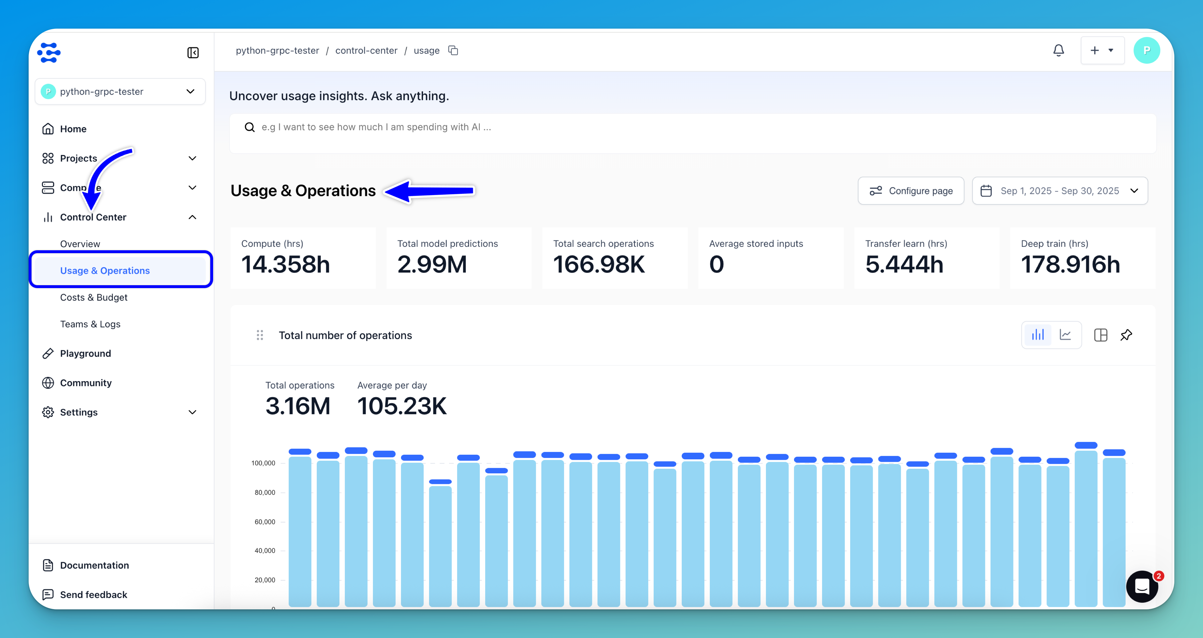 The Usage & Operations page has several charts that help you visualize your utilization of our platform during a selected period.