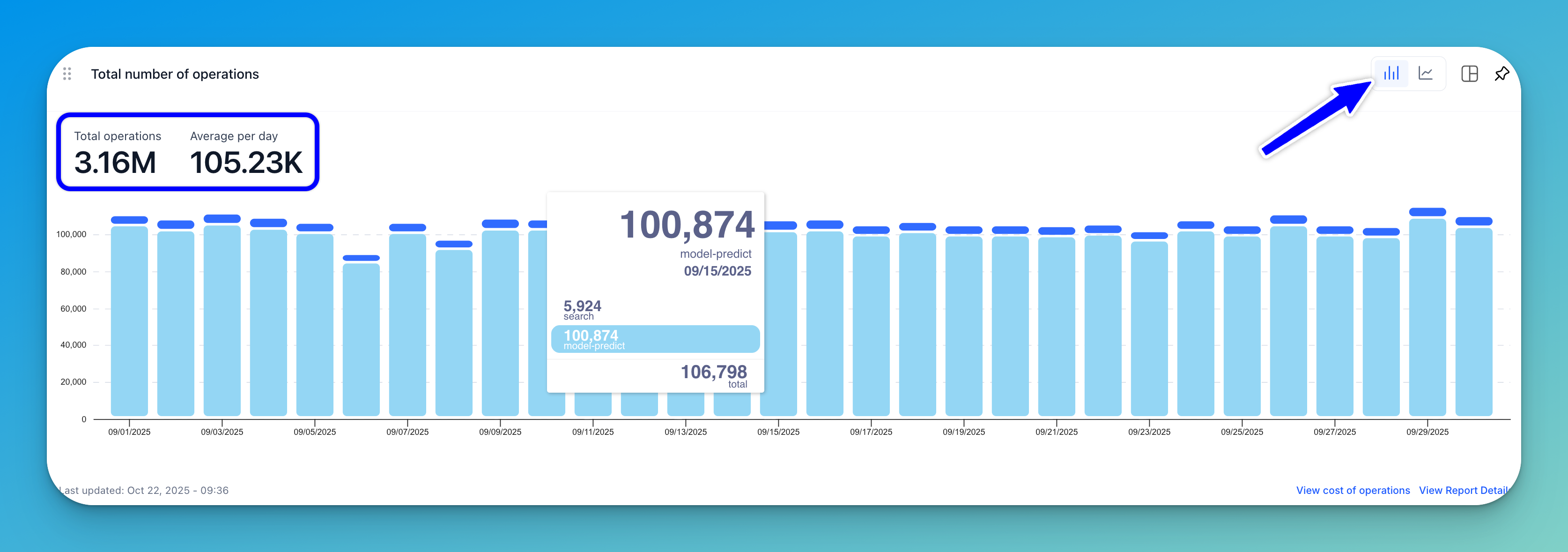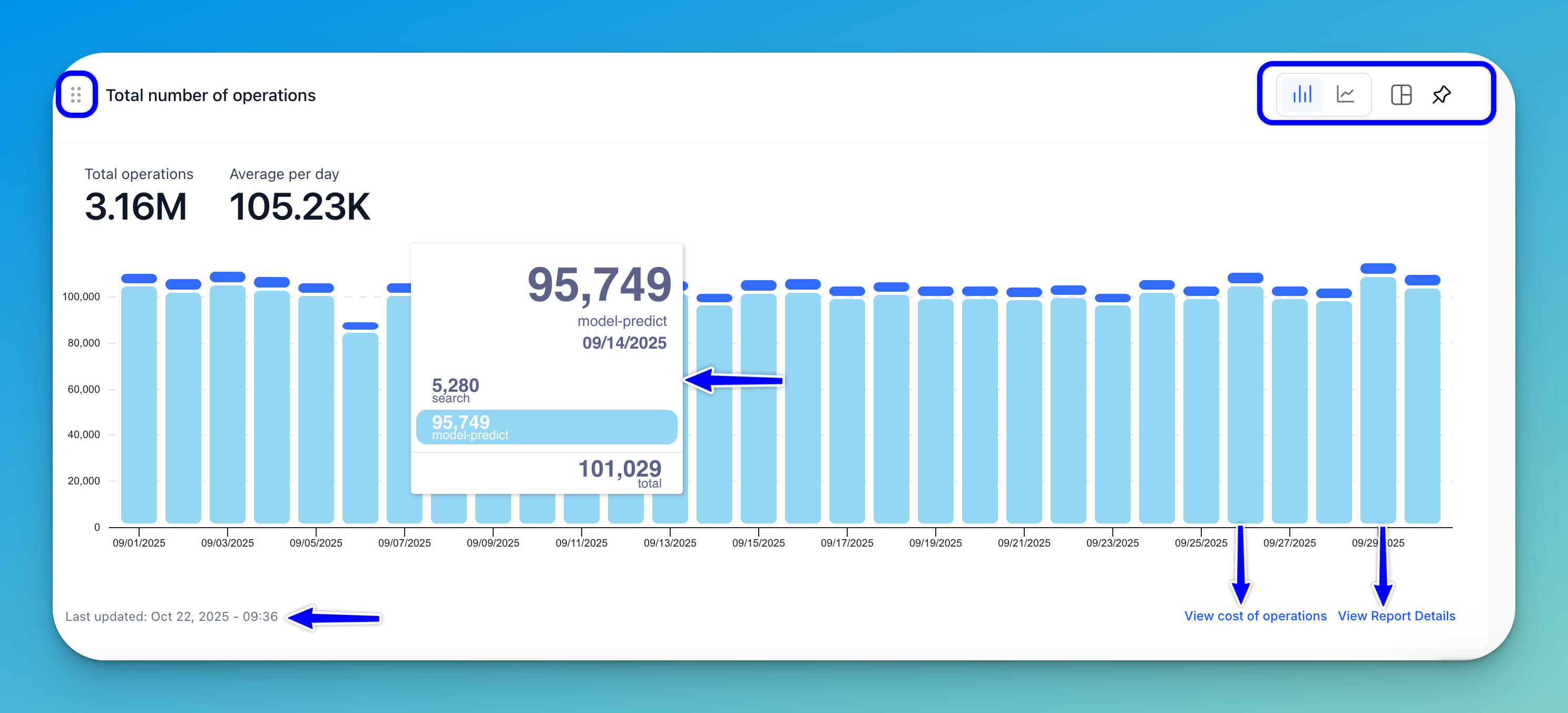 Cross-navigation links — The charts in the Usage & Operations tab are linked to related charts in the Costs & Budget tab, and vice versa. These cross-navigation links allow you to seamlessly explore related insights. For example, the Total Number of Operations chart includes a link in the lower-right corner that directs you to the corresponding Cost of Operations chart.