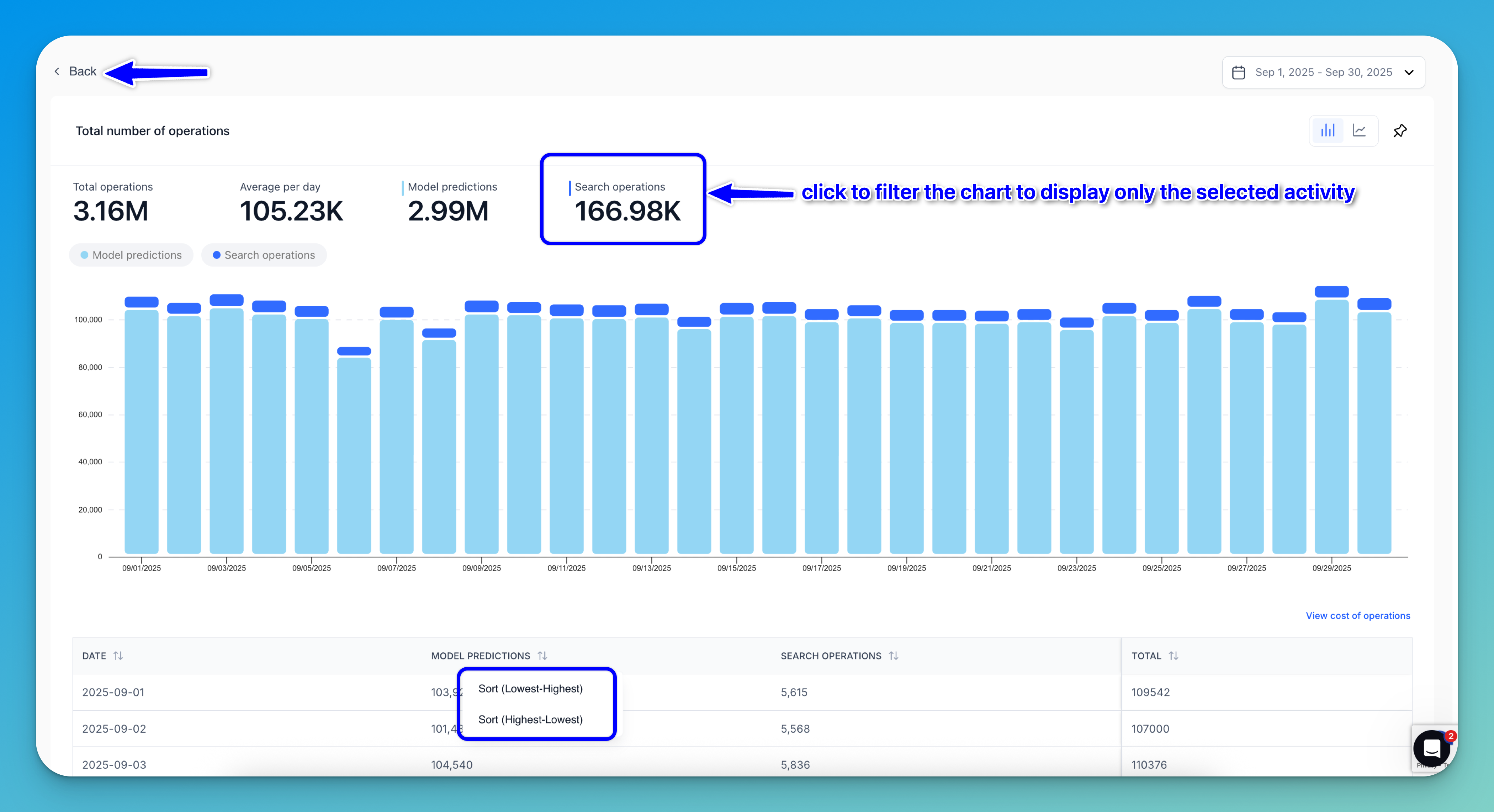 This section displays the total number of model operations, and the daily average, for the selected time period. It shows the operations by model ID and date.