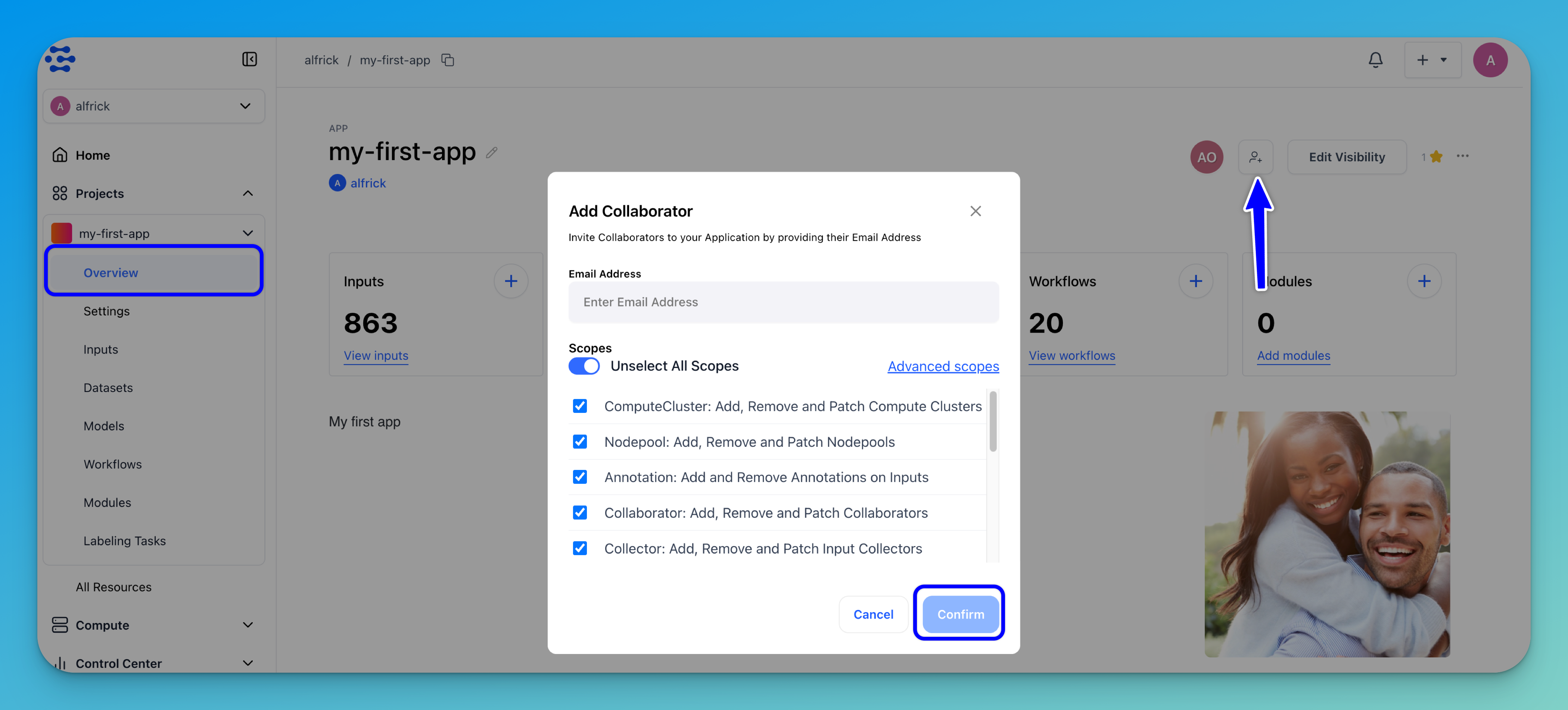 In the upper-right corner of the App Overview page, click the add collaborator button. Next, use the form that pops up to invite a collaborator — provide an email address associated with their Clarifai account, select their scopes, and click the Confirm button.