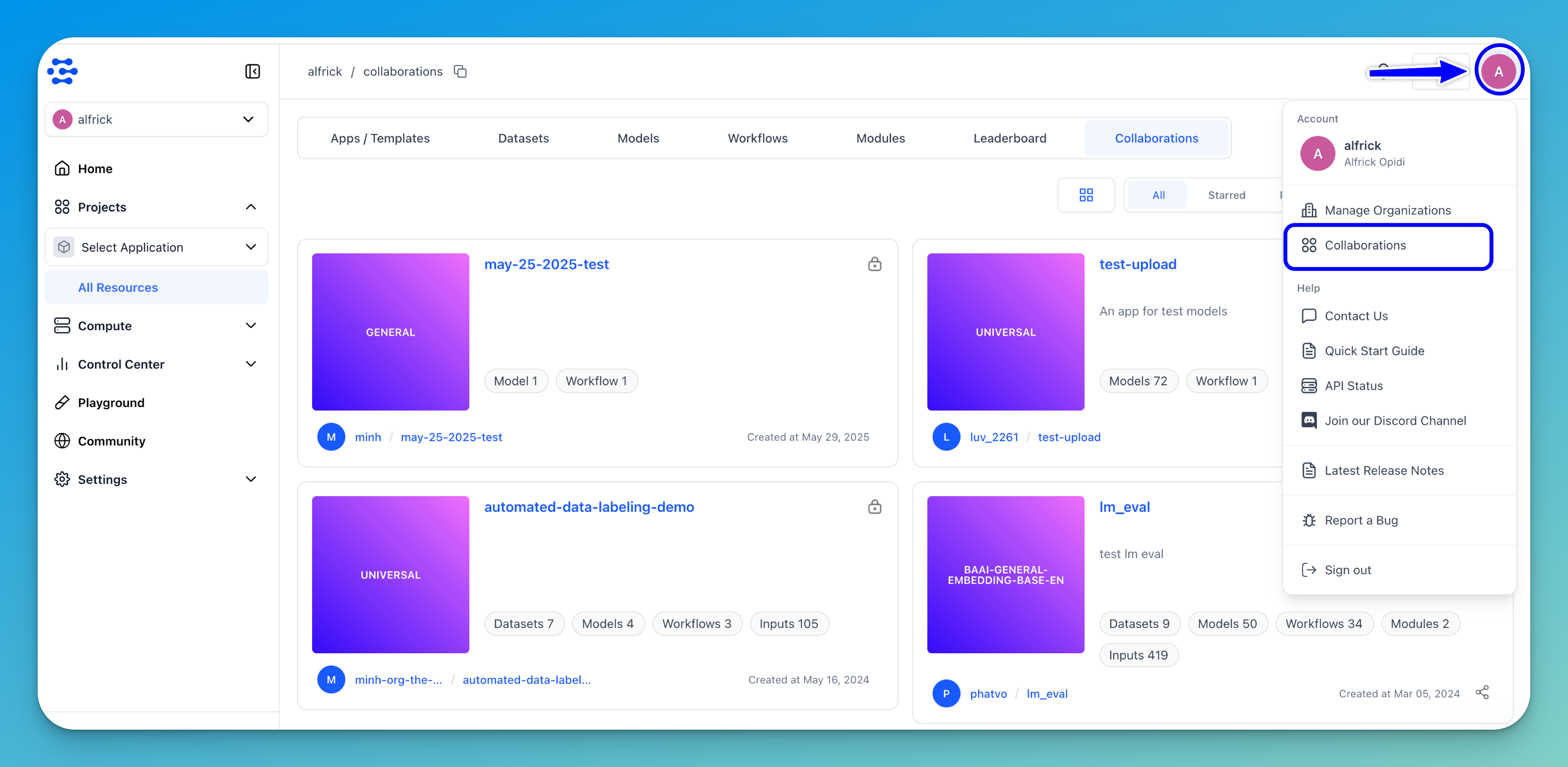 You can easily access the apps where you've been added as a collaborator. To do so, click your user profile icon in the upper-right corner of the Clarifai dashboard and select Collaborations from the dropdown menu.