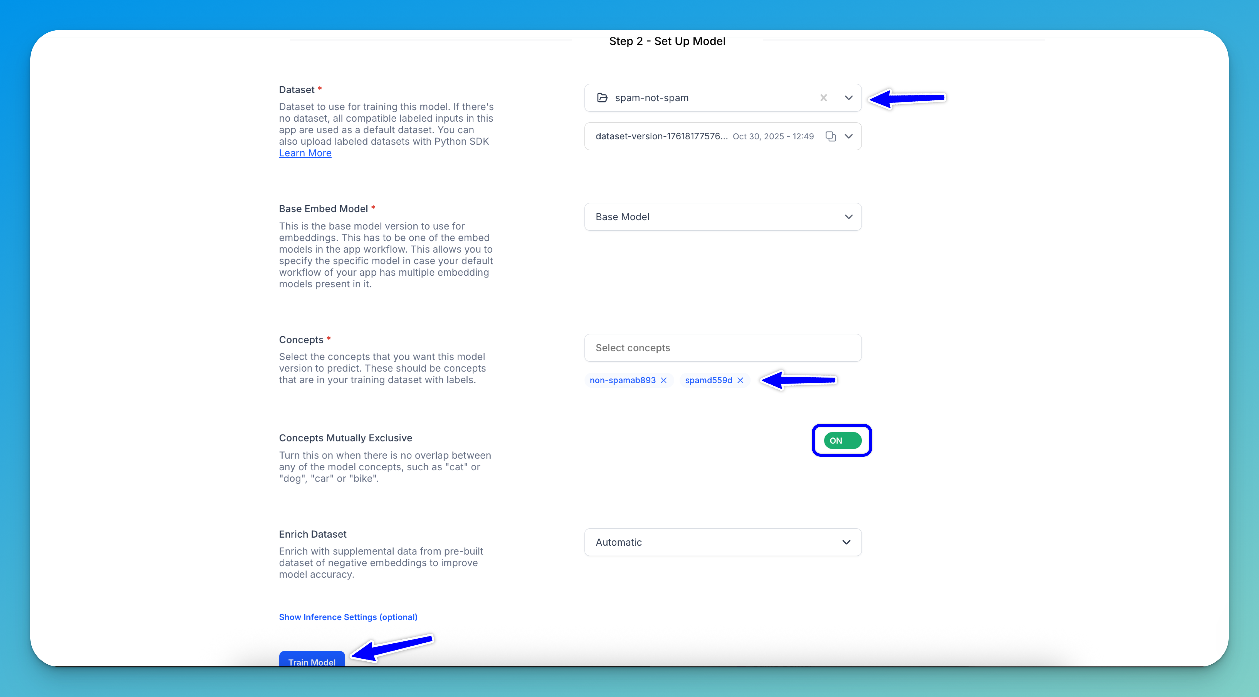 Automatic, this feature will enhance the model by including additional data from pre-built datasets with negative embeddings, improving accuracy. If set toDisabled, it will exclude these embeddings. Let's use the defaultAutomaticsetting for this example. - Configure inference settings (optional) — Optionally, adjust inference settings as needed for your model. You can set the maximum number of concepts to display in the results, minimum value of concept's probability score, additional hyperparameters, and training timeout in seconds.