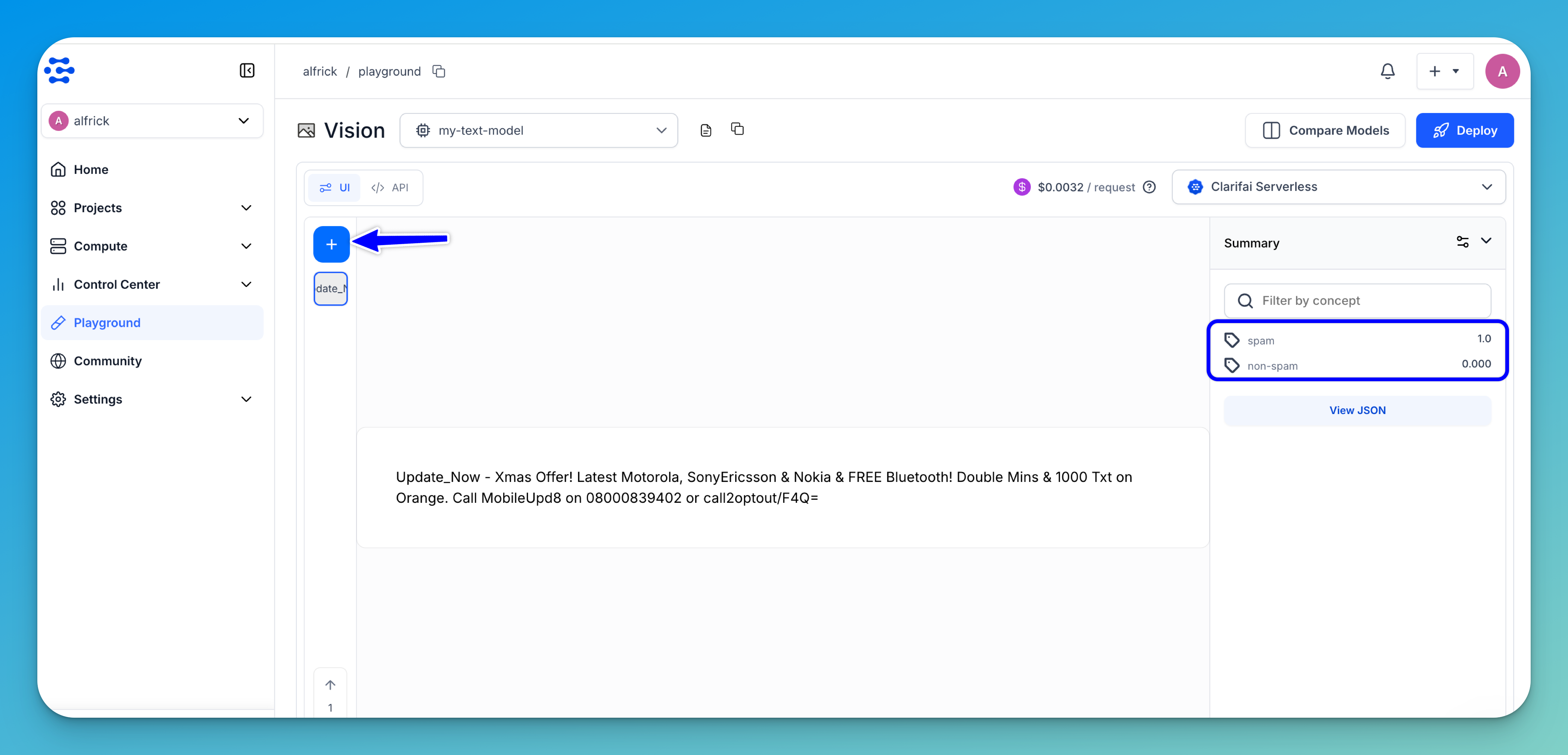 To test the model, click the blue Open in Playground button in the upper-right corner. This will take you to the AI Playground, where you can enter a text sample and view its classification results.