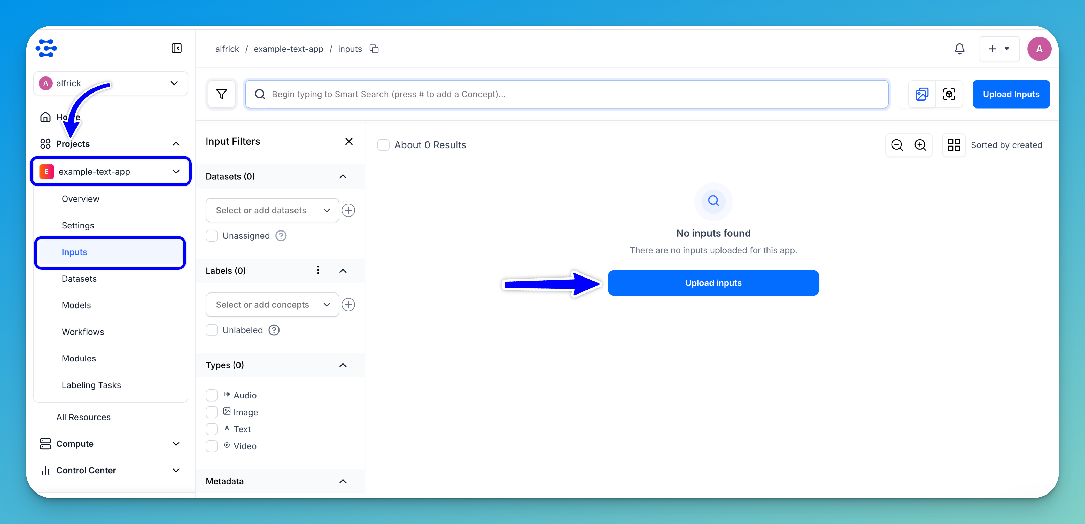 To upload inputs, open the collapsible left sidebar and select Projects. Choose your app from the dropdown menu, then click Inputs in the app’s sidebar.