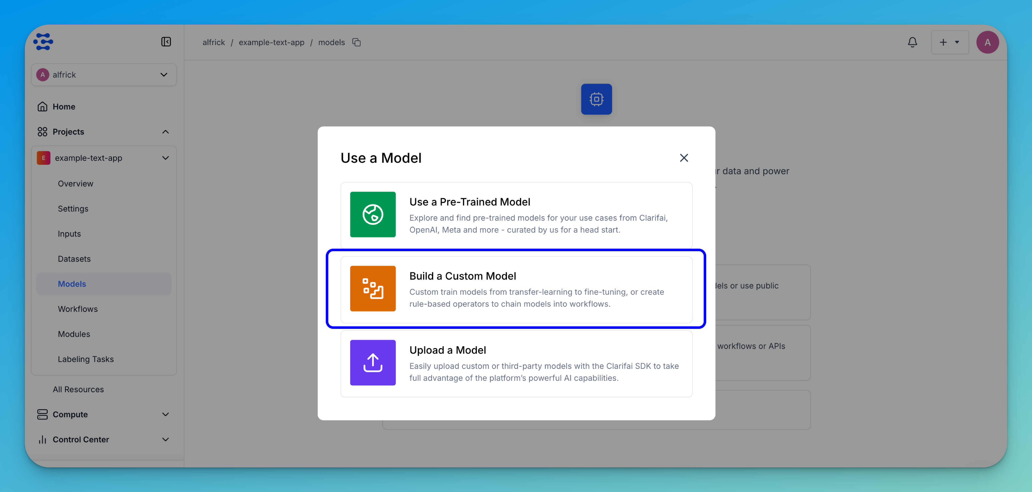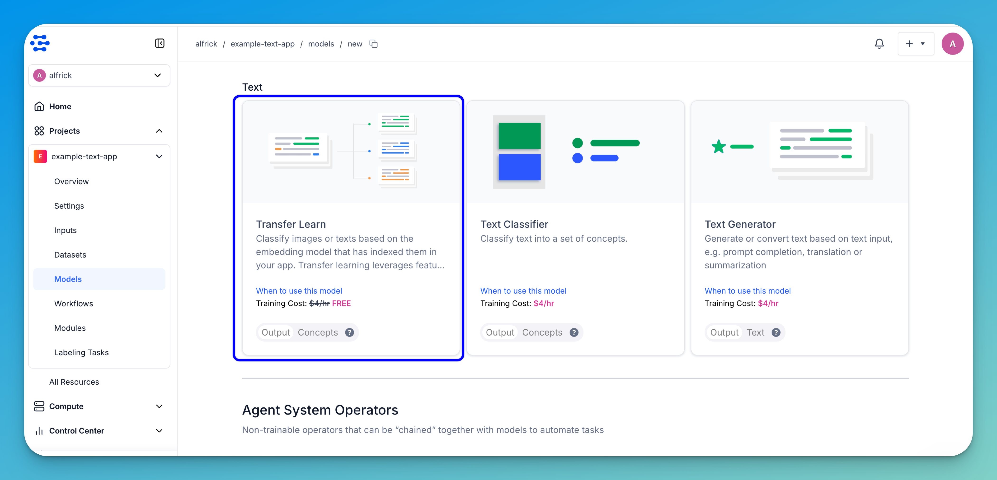 You'll then be redirected to a page where you can choose the model type. In the Text section, select the Transfer Learn model type.