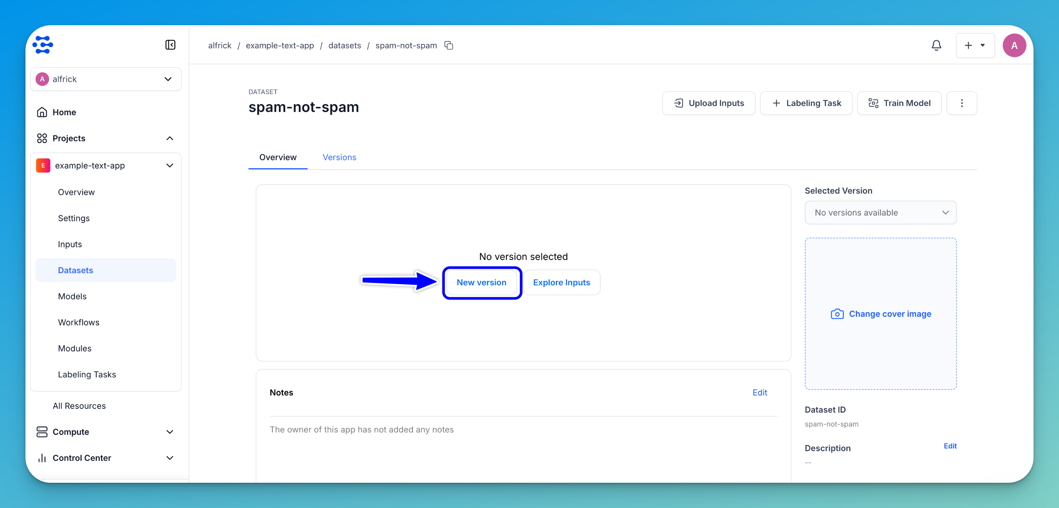 Next, navigate to your dataset's individual page and create a new version by clicking the New version button. This action bookmarks the current state of your dataset, allowing you to apply a specific version when training your custom text model.