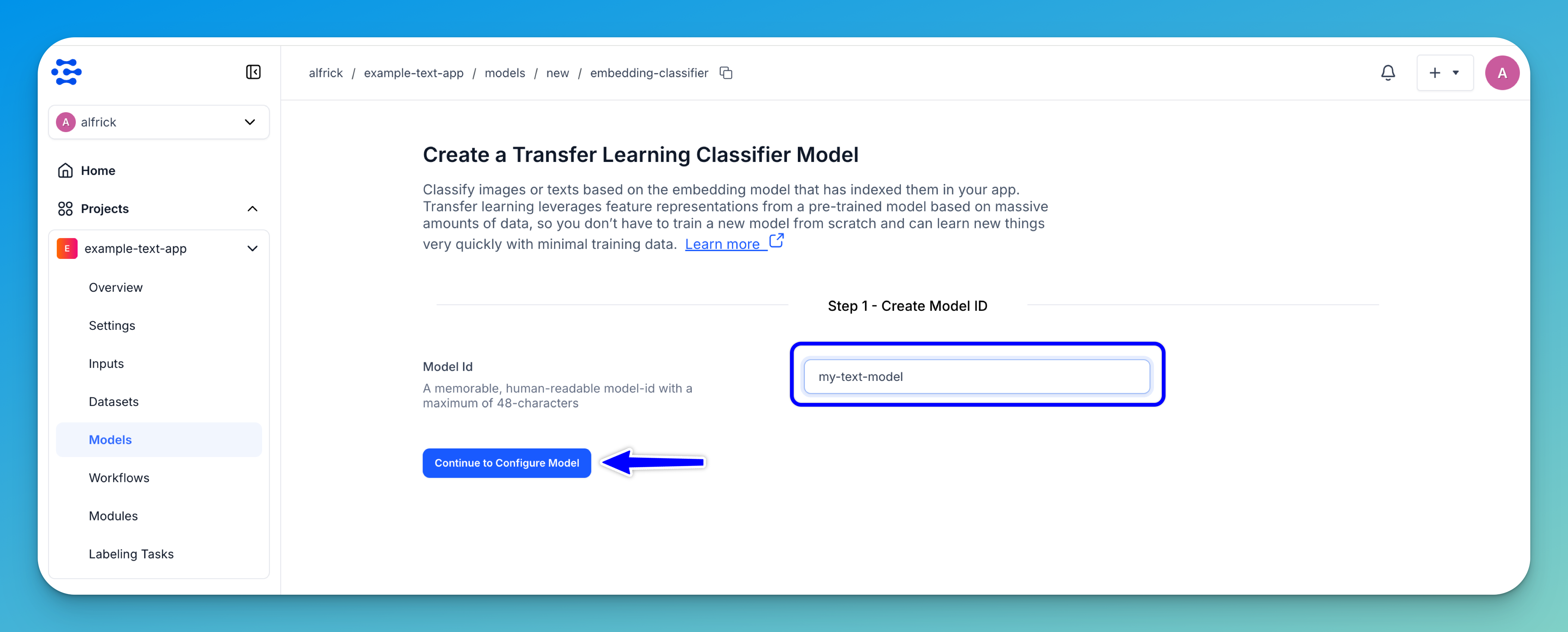 On the ensuing page, provide a unique ID and click the Continue to Configure Model button to create your model.