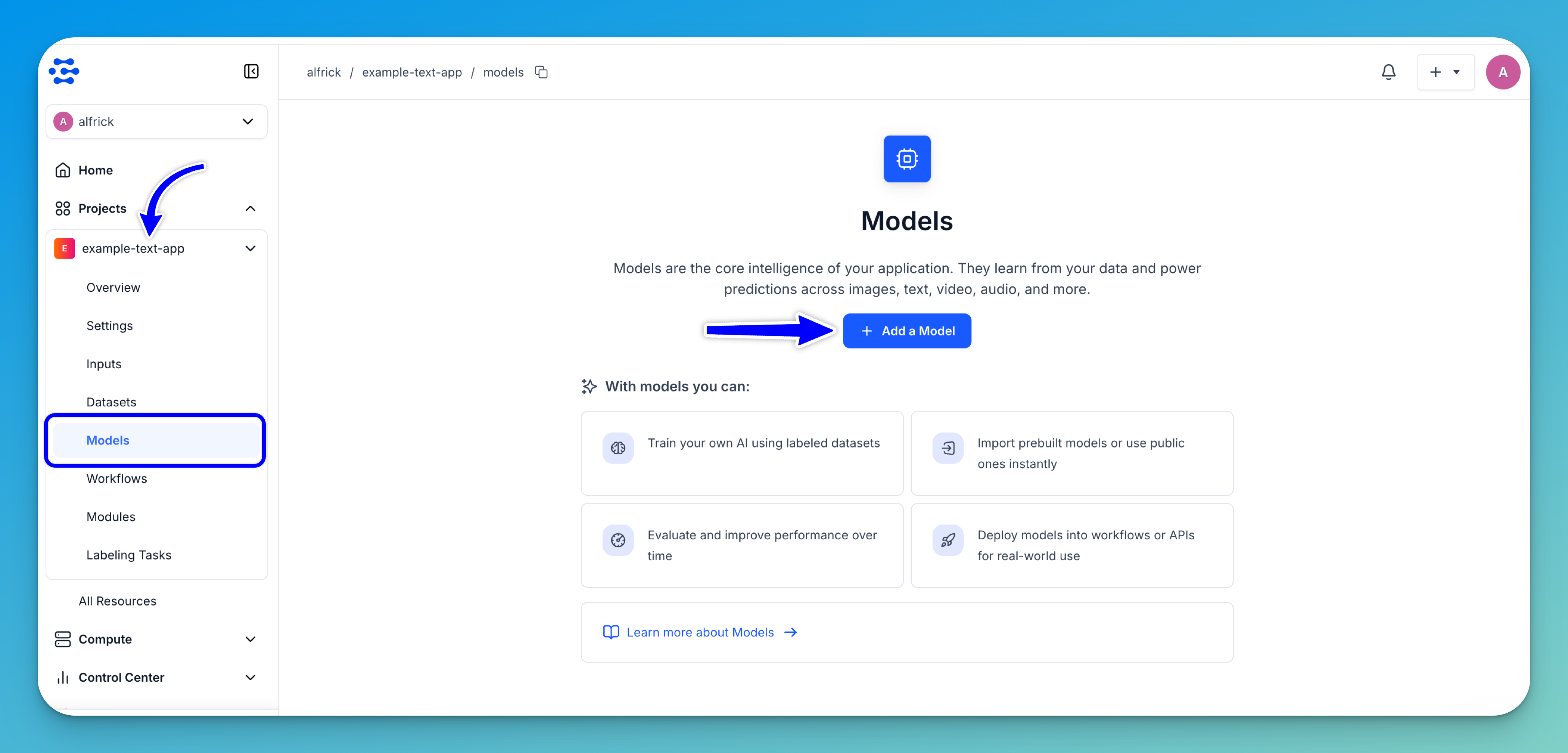 Begin by selecting the Models option in the app's collapsible left sidebar. On the ensuing page, click the Add a Model button.