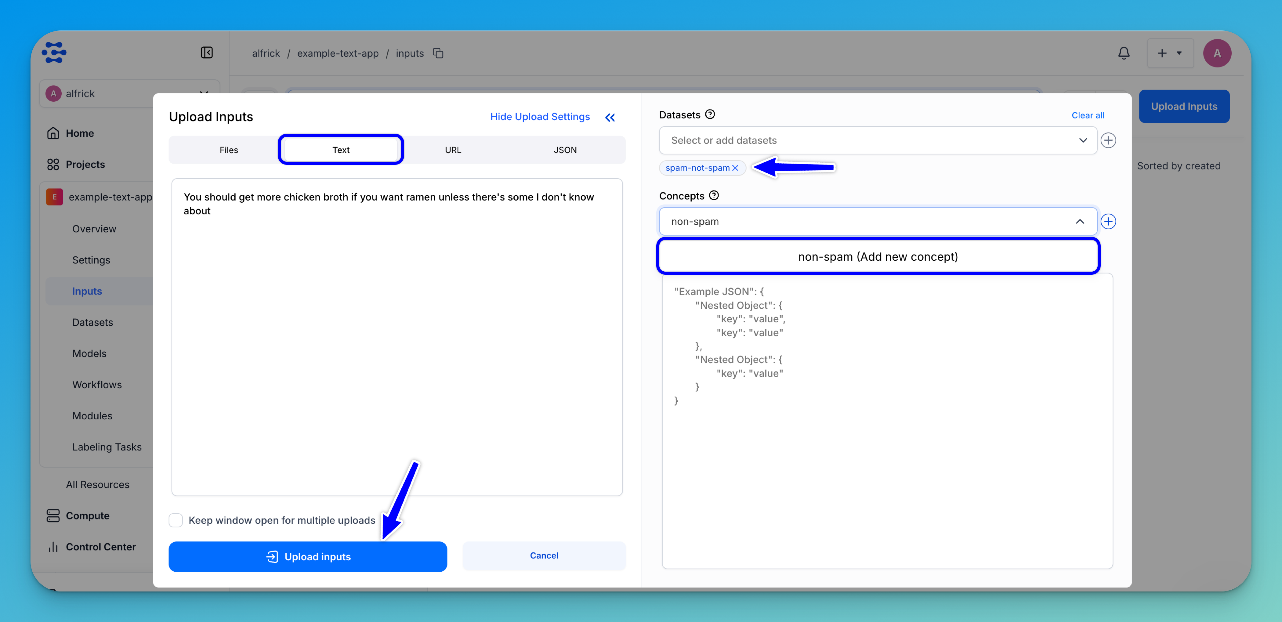 If you're adding text inputs directly, you'll need to repeat the process for each example message: select the dataset to which you want to add the input, choose the relevant concept, and then click the upload button.