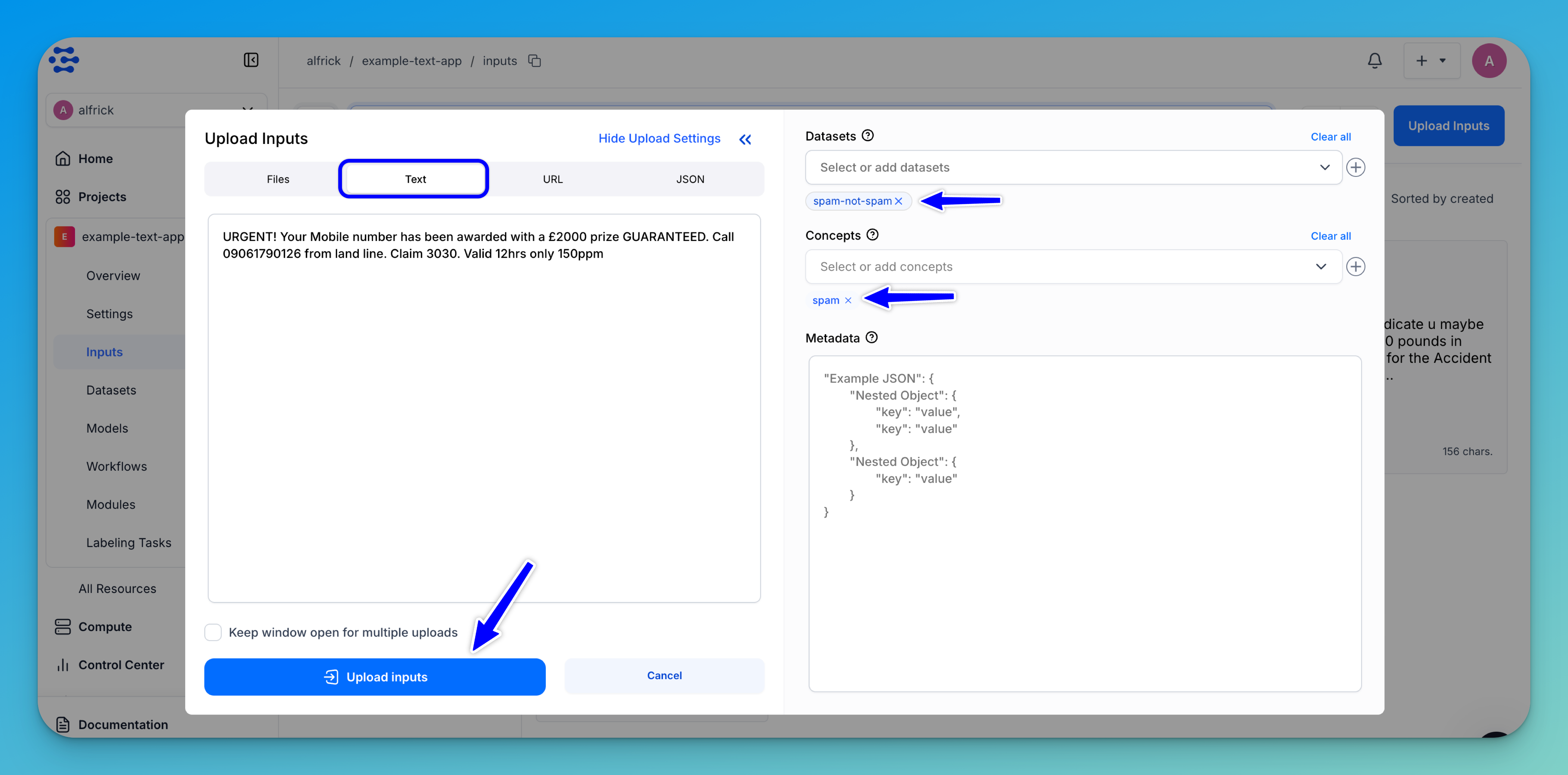 To complete the process, click Upload inputs at the bottom of the pop-up window to upload your annotated input to the selected dataset.