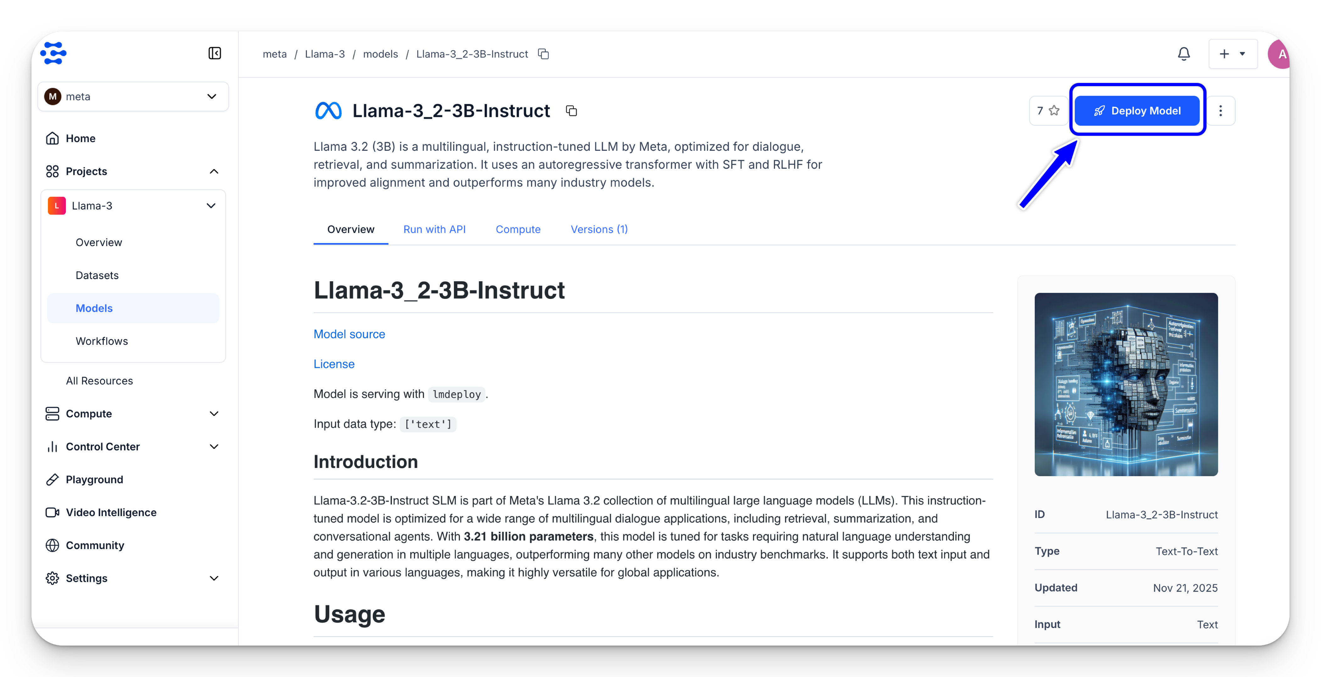 Next, on the deployed model’s page, click the Open in Playground button in the upper-right corner.