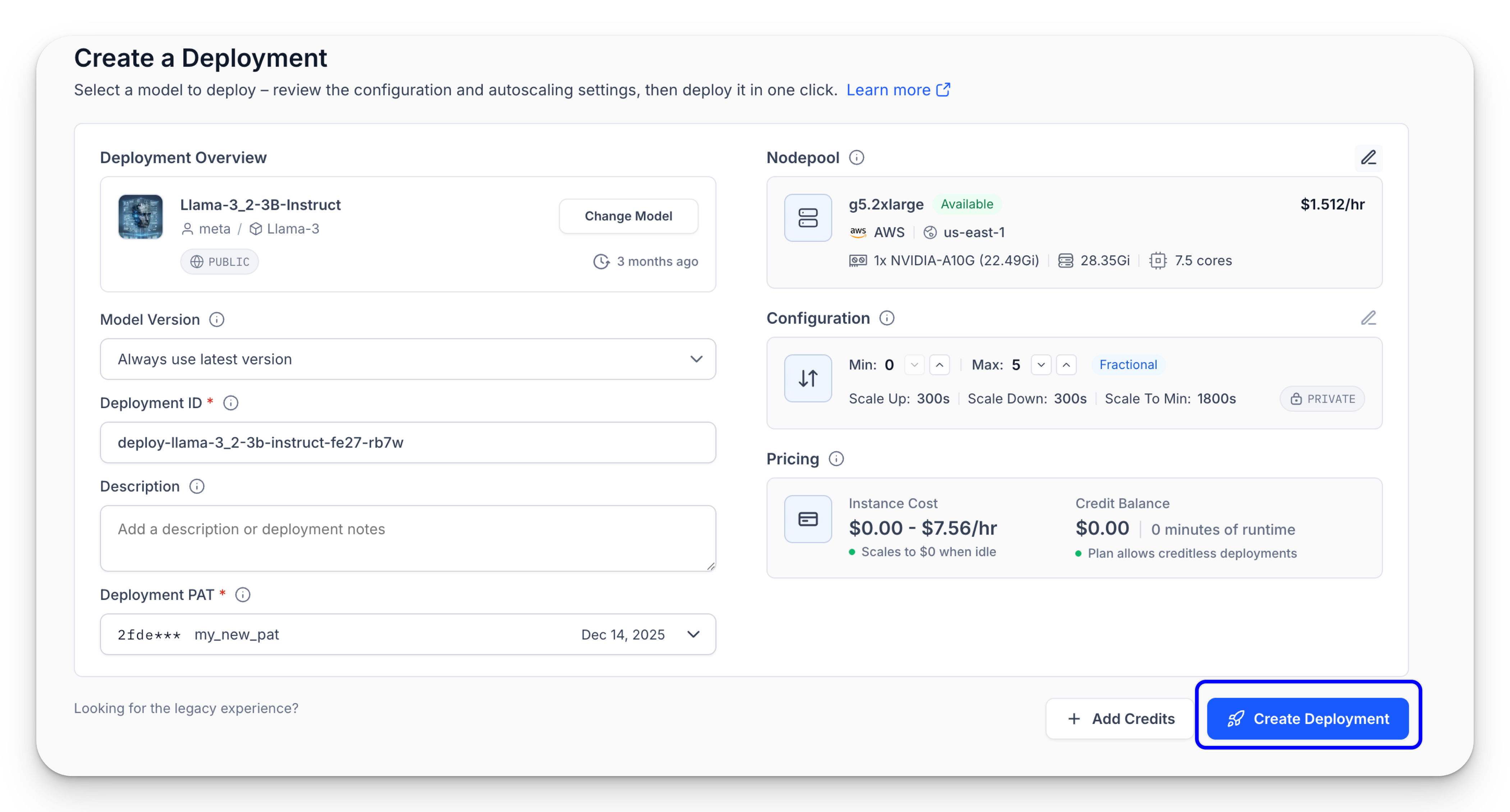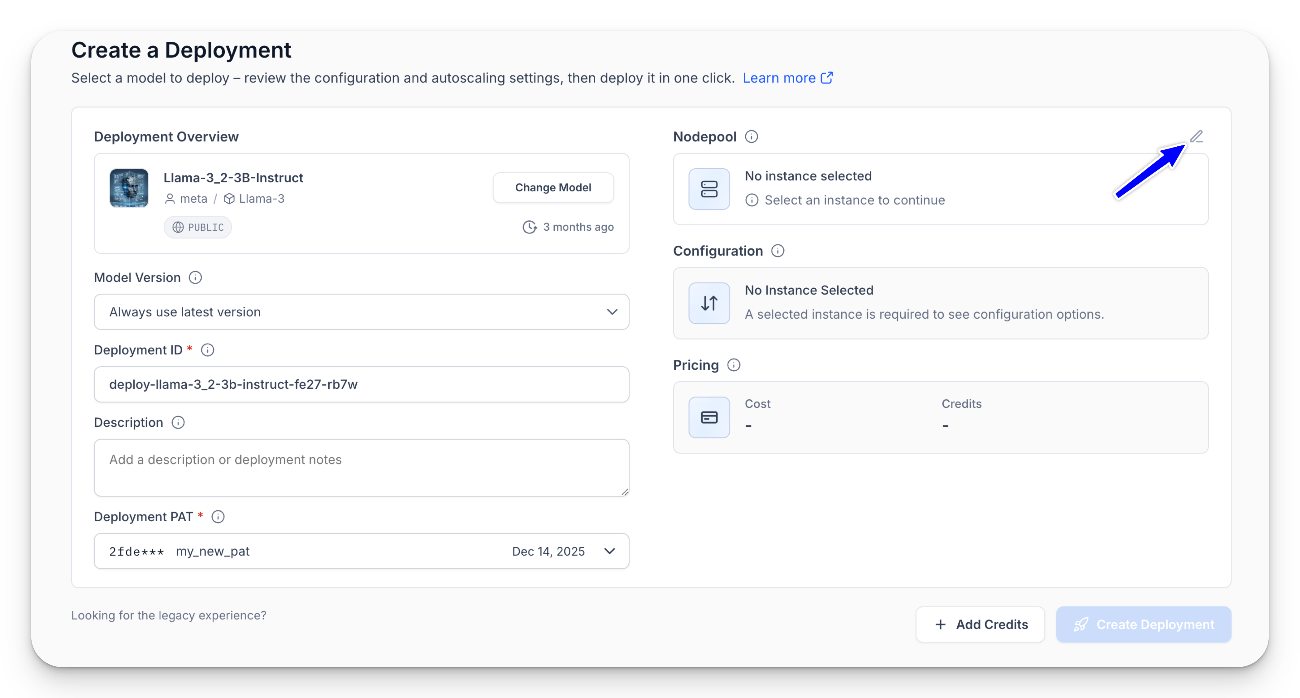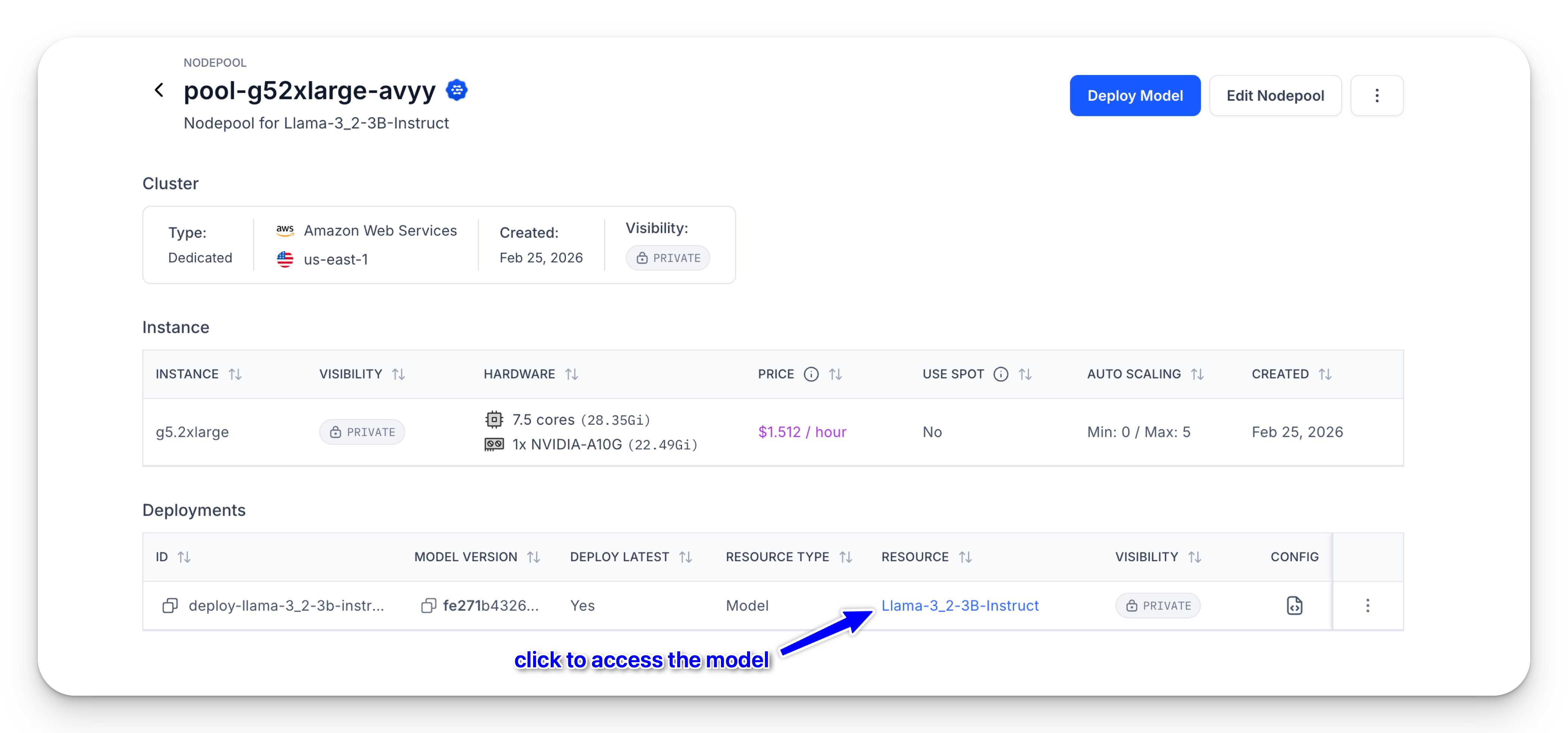 You’ll then be automatically redirected to the newly created nodepool page, where you can view your compute settings and the deployed model.