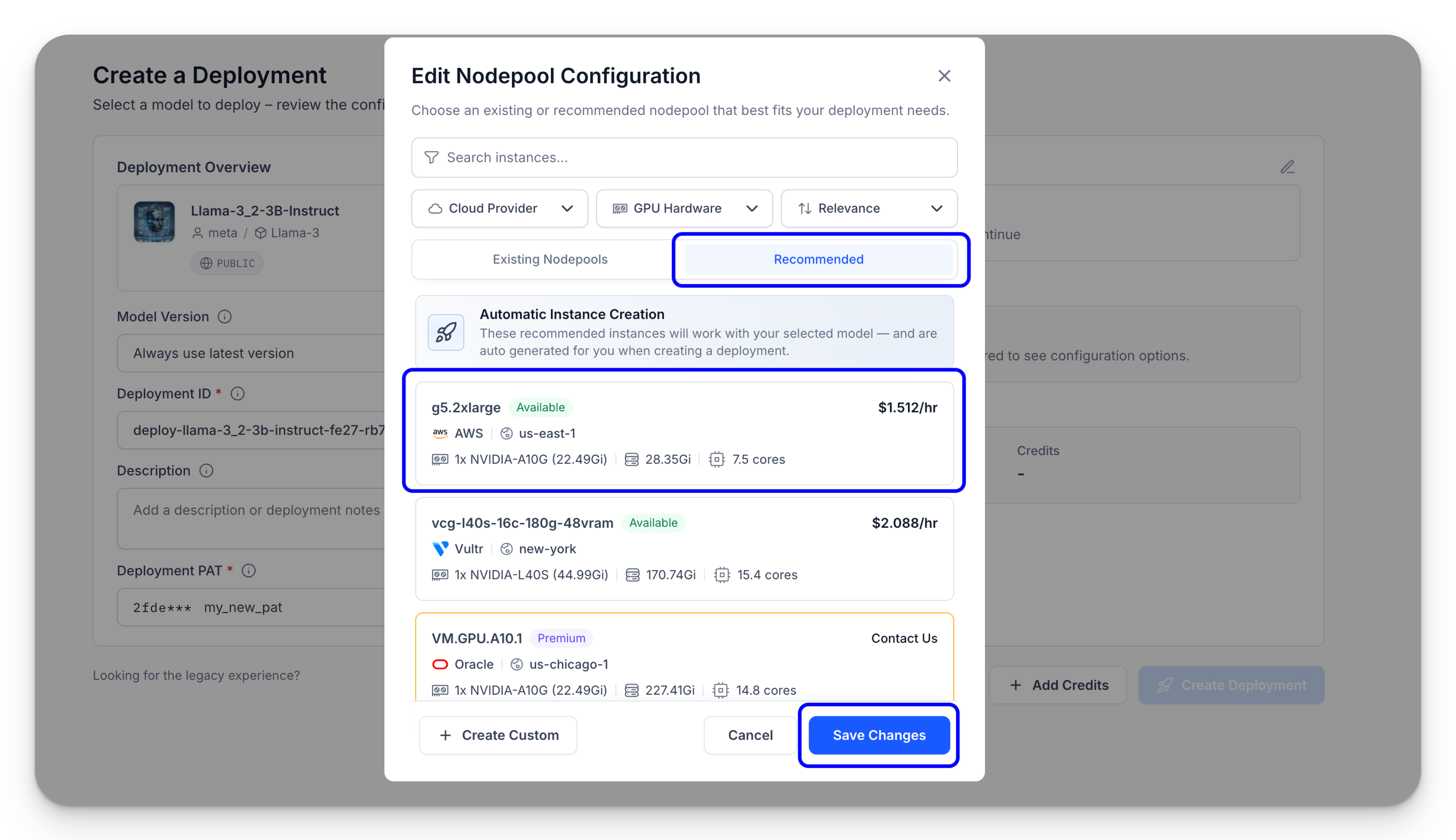 If you prefer more control and want to deploy the model using an existing cluster and nodepool, click the provided link in the pop-up window. This will allow you to customize the deployment based on your needs.