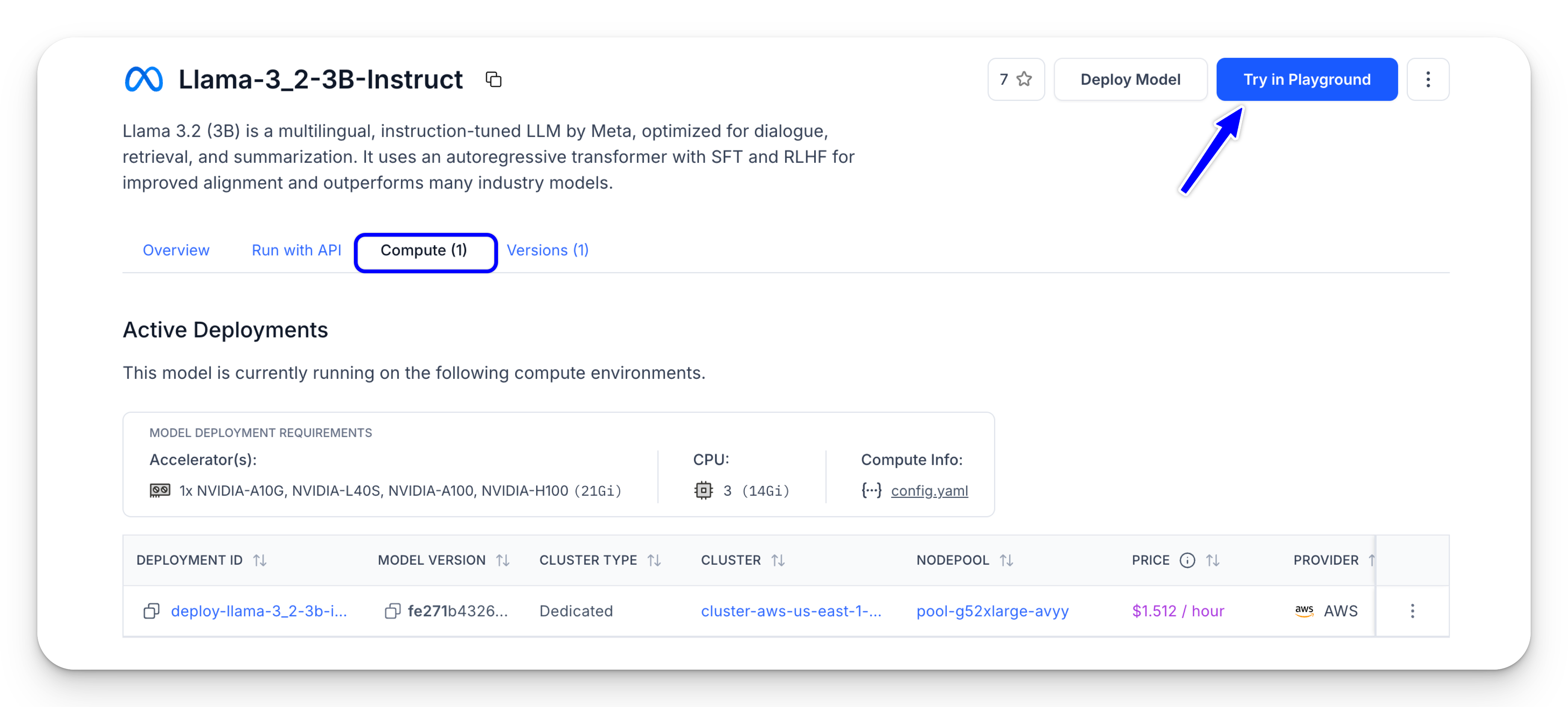 Note: On the model’s individual page, open the Compute tab to view details of the compute environment where it’s deployed.