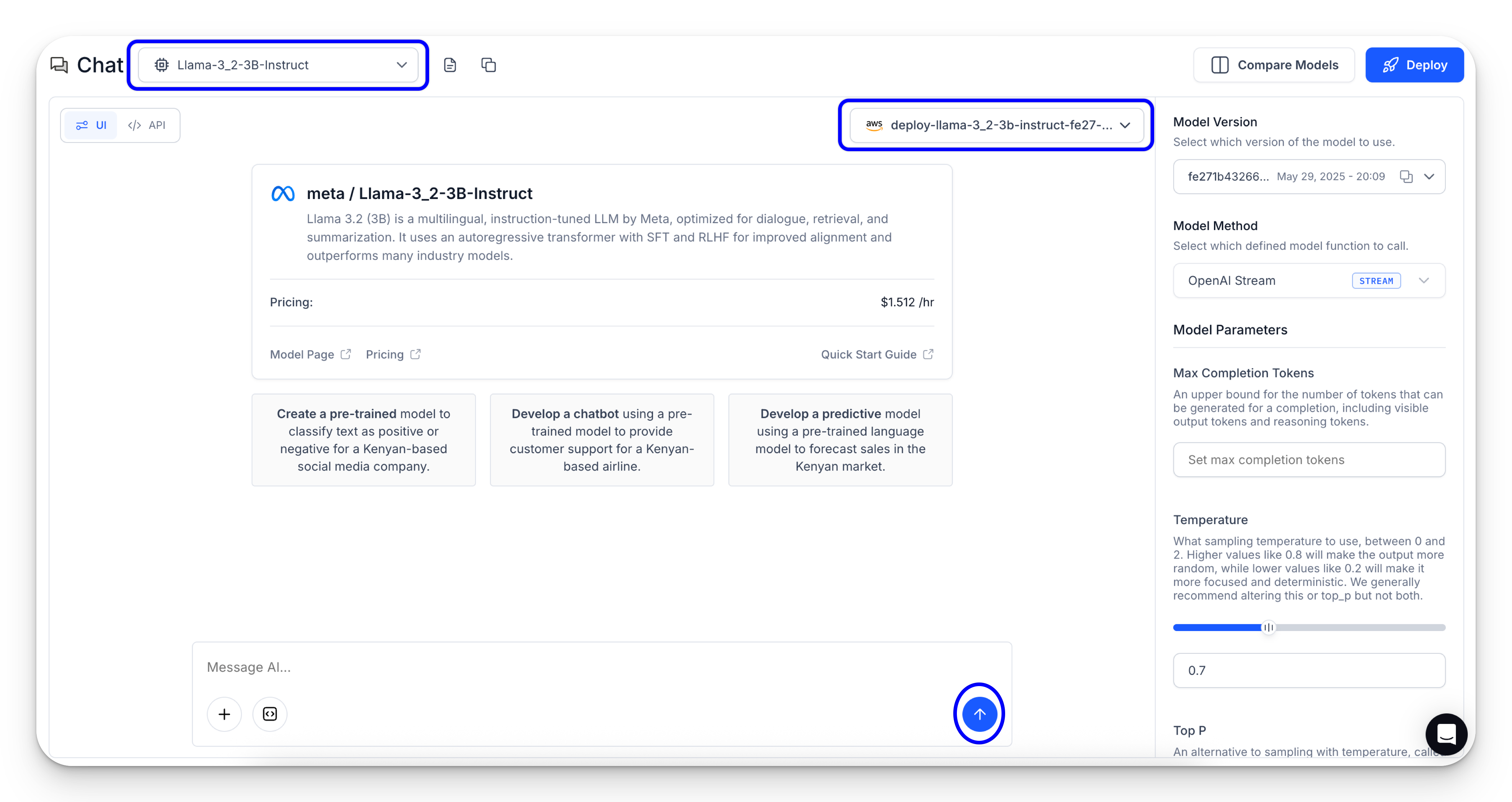 You’ll be taken to the Playground interface, where you can enter your prompt in the message box to run inferences using your deployed model. You can also try one of the predefined prompt examples.